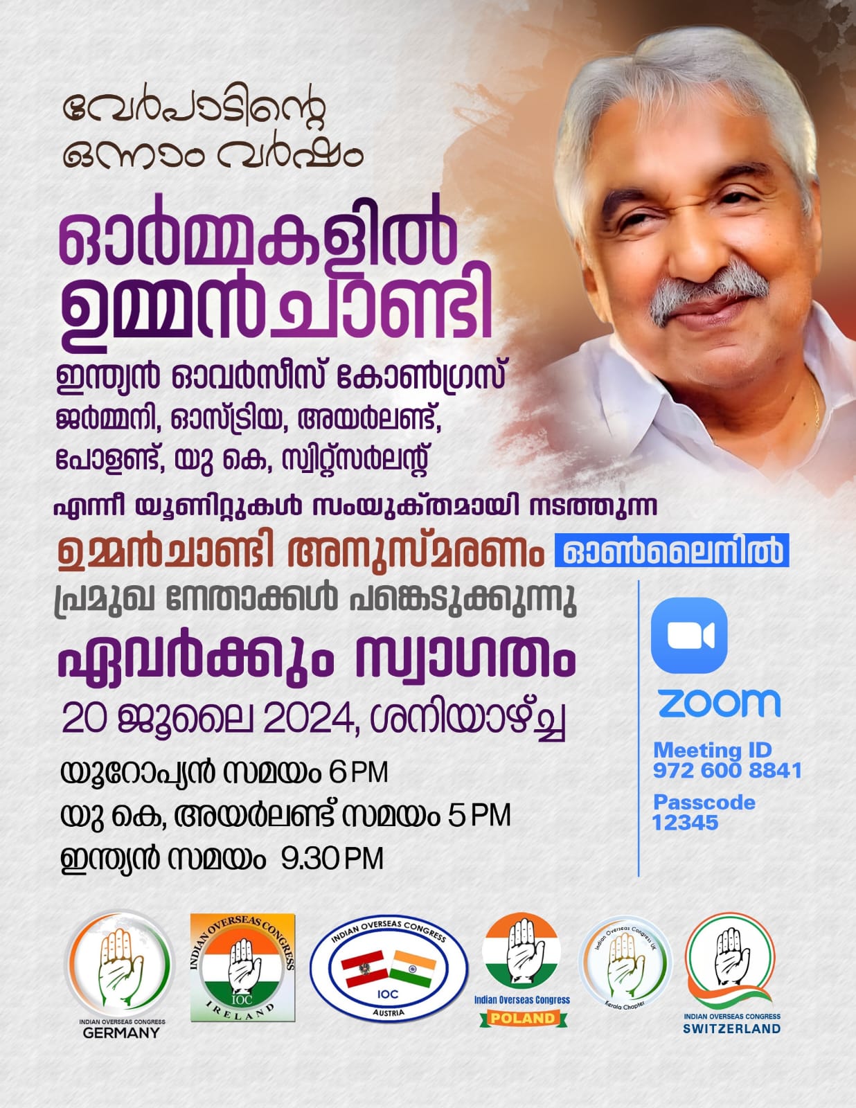 യൂറോപ്പ്: കേരള രാഷ്ട്രീയത്തിലെ ജനകീയ മുഖവും സൗമ്യതയുടേയും ജനപ്രീയതയുടെയും പ്രതീകവുമായിരുന്ന ശ്രീ. ഉമ്മൻ ചാണ്ടിയുടെ ജ്വലിക്കുന്ന സ്മരണകൾക്ക് മുന്നിൽ പ്രണാമം അർപ്പിച്ചുകൊണ്ട്, ഇന്ത്യൻ ഓവർസീസ് കോൺഗ്രസ്‌ (ഐഒസി) ജർമ്മനി, യു കെ, ഓസ്ട്രിയ, സ്വിറ്റ്സർലഡ്, പോളണ്ട് തുടങ്ങിയ യൂണിറ്റുകളുടെ ആഭിമുഖ്യത്തിൽ വിപുലമായ അനുസ്മരണ ചടങ്ങുകൾ സംഘടിപ്പിക്കുന്നു. ഓൺലൈൻ പ്ലാറ്റ്ഫോമായ സൂം (ZOOM) മുഖേന, ജൂലൈ 20 (ശനിയാഴ്ച) യൂറോപ് സമയം 6 PM, യു കെ – അയർലണ്ട് സമയം 5 PM, ഇന്ത്യൻ സമയം 9.30 PM – ന് ആണ് “ഓർമകളിൽ ഉമ്മൻ ചാണ്ടി” എന്ന തലക്കെട്ടിൽ അനുസ്മരണ ചടങ്ങ് സംഘടിപ്പിക്കുന്നത്.