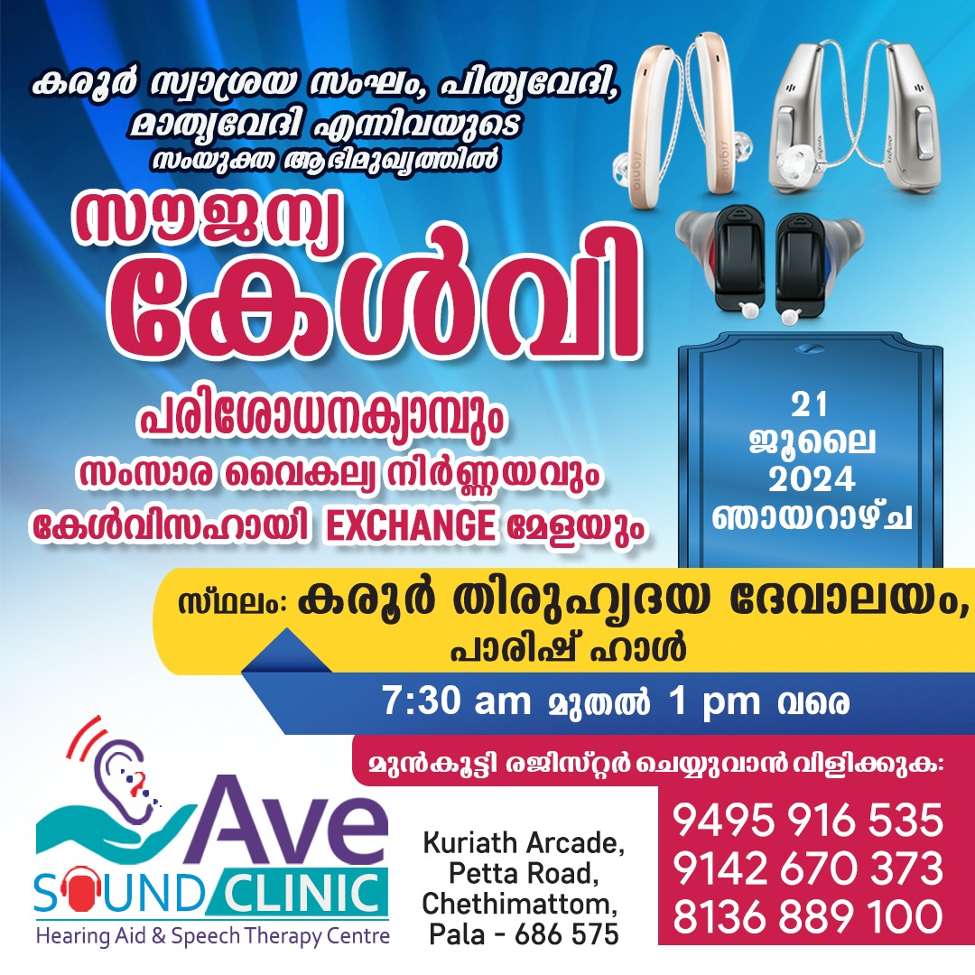 കരൂർ തിരുഹൃദയ ദേവാലയ പാരിഷ് ഹാളിൽ വച്ച് 2024 ജൂലൈ 21 ഞായറാഴ്ച രാവിലെ 7:30 മുതൽ 1 PM വരെ പാലാ ആവേ സൗണ്ട് ക്ലിനിക്കിന്റെ ആഭിമുഖ്യത്തിൽ കരൂർ സ്വാശ്രയ സംഘവും, പിതൃവേദി, മാതൃവേദിയും ചേർന്ന് സൗജന്യ കേൾവി പരിശോധന ക്യാമ്പും,