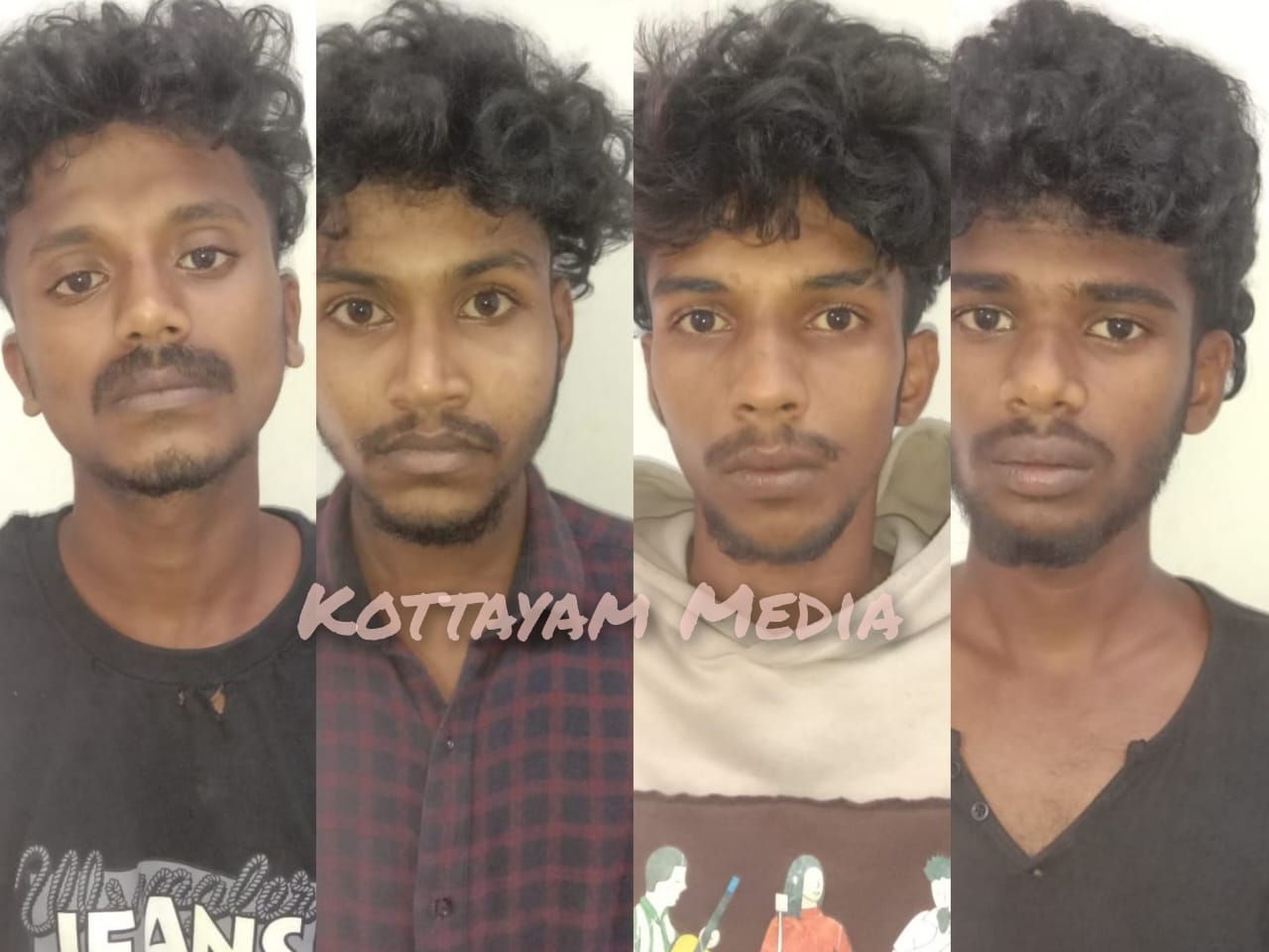 കോട്ടയം : രണ്ടിടങ്ങളിലായി നടത്തിയ മോഷണ കേസിലെ നാൽവർ സംഘത്തെ പോലീസ് പിടികൂടി. പുതുപ്പള്ളി പൊങ്ങൻപാറ ഭാഗത്ത് മാളിയേക്കൽ വീട്ടിൽ ദീപു എം പ്രദീപ് (20), മുട്ടമ്പലം കൈതത്തറ വീട്ടിൽ (ഇറഞ്ഞാൽ ഭാഗത്ത് വാടകയ്ക്ക് താമസം) അനൂപ് എ.കെ (21), മുട്ടമ്പലം കാക്കനാട്ട് പുതുപ്പറമ്പിൽ വീട്ടിൽ (പനച്ചിക്കാട് നാൽക്കവല ഭാഗത്ത് വാടകയ്ക്ക് താമസം റിജോ റെജി (19), തിരുവഞ്ചൂർ ചമയംകര ഭാഗത്ത് കനകത്തിൽ വീട്ടിൽ ജോയൽ എന്ന് വിളിക്കുന്ന സി.റ്റി. ഉമ്മൻ (21) എന്നിവരെയാണ് കോട്ടയം ഈസ്റ്റ് പോലീസ് അറസ്റ്റ് ചെയ്തത്.