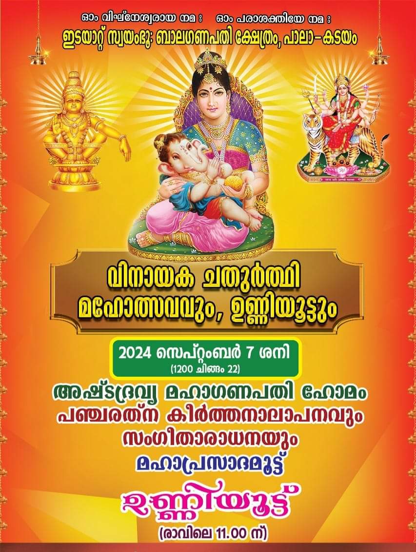 പാലാ: ഇടയാറ്റ് സ്വയംഭൂ: ബാലഗണപതിക്ഷേത്രത്തിൽ വിനായക ചതുർത്ഥി ആഘോഷത്തിന്റെ ഭാഗമായി അഷ്ടദ്രവ്യ മഹാഗണപതിഹോമവും ഉണ്ണിയൂട്ടും നാളെ നടക്കും. അമ്മയുടെ മടിയിൽ ഇരി ക്കുന്ന ബാലഭാവത്തിലുള്ള ഗണപതിയാണ് ക്ഷേത്രത്തി ലെ പ്രധാന പ്രതിഷ്ഠ. അ തിനാൽ കുട്ടികൾകൾക്കായി നടത്തുന്ന ഉണ്ണിയൂട്ടിന് ഇവിടെ വലിയ പ്രാധാന്യമുണ്ടെന്ന് ക്ഷേത്രം ഭാരവാഹികൾ അറിയിച്ചു.