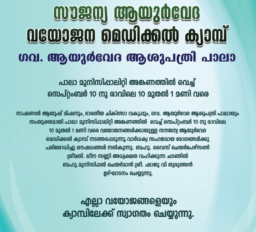 പാലാ :ഗവൺമെൻറ് ആയുർവേദ ആശുപത്രി, പാലാ നാഷണൽ ആയുഷ് മിഷനുമായി ചേർന്ന് 60 വയസ്സ് കഴിഞ്ഞവർക്കായി സൗജന്യ മെഡിക്കൽ ക്യാമ്പ് സംഘടിപ്പിക്കുന്നു. സെപ്റ്റംബർ 10 ചൊവ്വാഴ്ച , പാലാ മുനിസിപ്പാലിറ്റി അങ്കണത്തിൽ വച്ച് രാവിലെ 10 മണി മുതൽ ഉച്ചയ്ക്ക് ഒരു മണി വരെ ആണ് മെഡിക്കൽ ക്യാമ്പ് നടത്തുന്നത്. ഈ പരിപാടിയിലേക്ക് നിങ്ങളേവരെയും സ്വാഗതം ചെയ്തു കൊള്ളുന്നു. പരമാവധി ജനങ്ങൾക്ക് പ്രയോജനം ചെയ്യുന്ന രീതിയിൽ ഓരോ വാർഡിൽ നിന്നും പങ്കാളിത്തം ഉറപ്പാക്കാൻ സഹകരിക്കണം എന്ന് അഭ്യർത്ഥിക്കുന്നു.