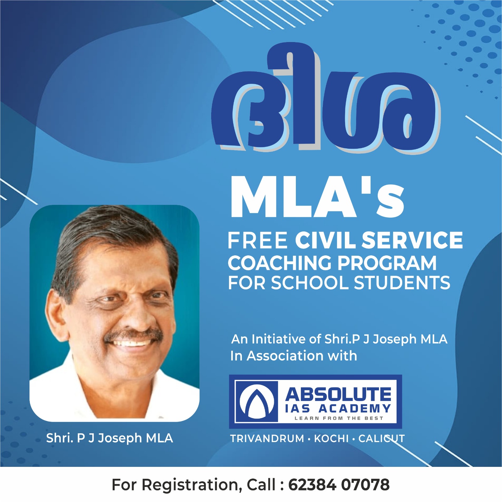 തൊടുപുഴ : പി.ജെ ജോസഫ് എം.എൽ.എ യുടെ നേതൃത്വത്തിൽ തൊടുപുഴ നിയോജക മണ്ഡലത്തിൽപ്പെട്ട സ്കൂൾ വിദ്യാർത്ഥികൾക്കായി സൗജന്യ സിവിൽ സർവീസ് പരിശീലന പരിപാടി ‘ദിശ ‘ഒക്ടോബർ 2 ഗാന്ധി ജയന്തി ദിനത്തിൽ ആരംഭിക്കുന്നു.തൊടുപുഴ നിയോജകമണ്ഡലത്തിൽ നിന്നും അടുത്ത പത്ത് വർഷത്തിനുള്ളിൽ കേന്ദ്ര- സംസ്ഥാന സർക്കാരുകളിലെ ഉന്നത പദവികളിലേക്ക് വിദ്യാർഥികളെ വാർത്തെടുക്കുകയാണ് പദ്ധതിയുടെ ലക്ഷ്യം. തിരുവനന്തപുരം കേന്ദ്രമാക്കി പ്രവർത്തിക്കുന്ന അബ്സൊല്യൂട്ട് ഐ. എ. എസ് അക്കാദമിയുമായി ചേർന്നാണ് പദ്ധതി നടപ്പിലാക്കുന്നത്.