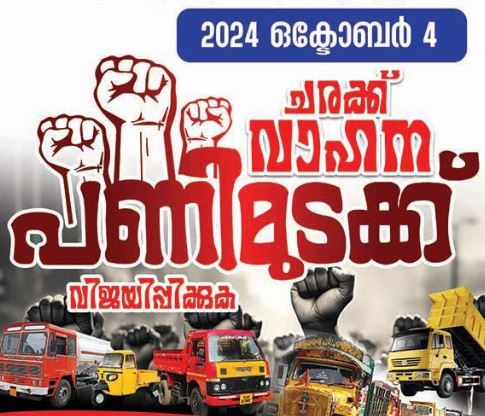 കൊച്ചി: വിവിധ ആവശ്യങ്ങൾ ഉന്നയിച്ച് സംസ്ഥാന വ്യാപകമായി ഒക്ടോബർ നാലിന് കേരളത്തിലെ ചരക്ക് വാഹന തൊഴിലാളി സംയുക്ത ട്രേഡ് യൂണിയനും ഗുഡ്സ് വാഹന ഉടമാ സം ഘടനകളും സംയുക്തമായി ഇരുപത്തിനാല് മണിക്കൂർ കേരളത്തിലെ ചരക്ക് വാഹനങ്ങൾ പണിമുടക്കി ക്കൊണ്ട് അന്നേ ദിവസം പതിമൂന്ന് ജില്ലകളിലേയും കളക്ടറേറ്റിന് മുന്നിലും തിരുവനന്തപുരത്ത് സെക്രട്ടറിയേറ്റിന് മുന്നിലും പ്രകടനവും ധർണ്ണയും നടത്താൻ തീരുമാനിച്ചിട്ടുണ്ട്.