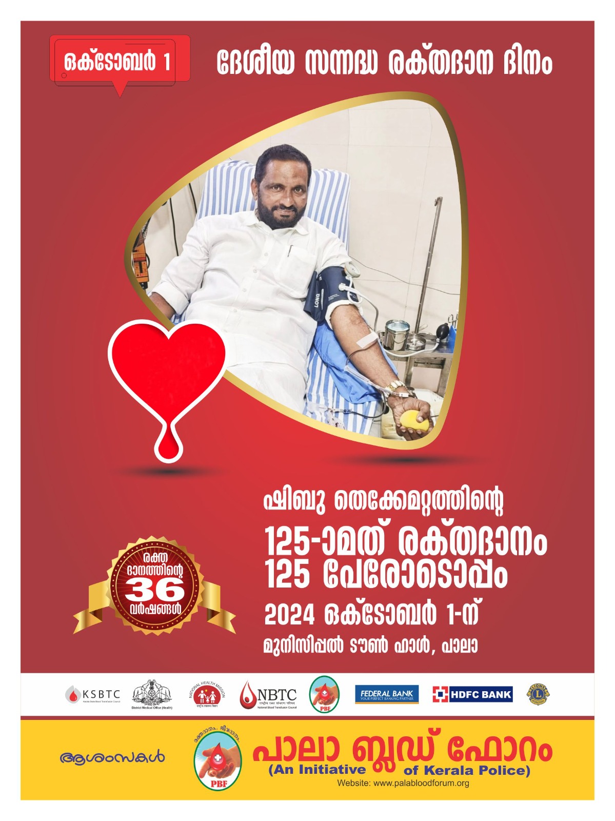ദിനാചരണത്തിന്റെ ഭാഗമായി കോട്ടയം ജില്ലയിൽ 125-ാം തവണ 125 പേരോടൊപ്പം രക്തം ദാനം ചെയ്യുന്ന പാലാ ബ്ലഡ് ഫോറം ജനറൽ കൺവീനർ ഷിബു തെക്കേമറ്റത്തെ ആദരിക്കുകയും ചെയ്യുന്നു. അന്നേ ദിവസം പാലാ ടൗൺ ഹാളിൽ നടക്കുന്ന മെഗാ രക്തദാന ക്യാമ്പിൽ പാലായിലെ വിവിധ വിദ്യാഭ്യാസ സ്ഥാപനങ്ങളിലെ യുവജങ്ങൾ രക്തം ദാനം ചെയ്യും.