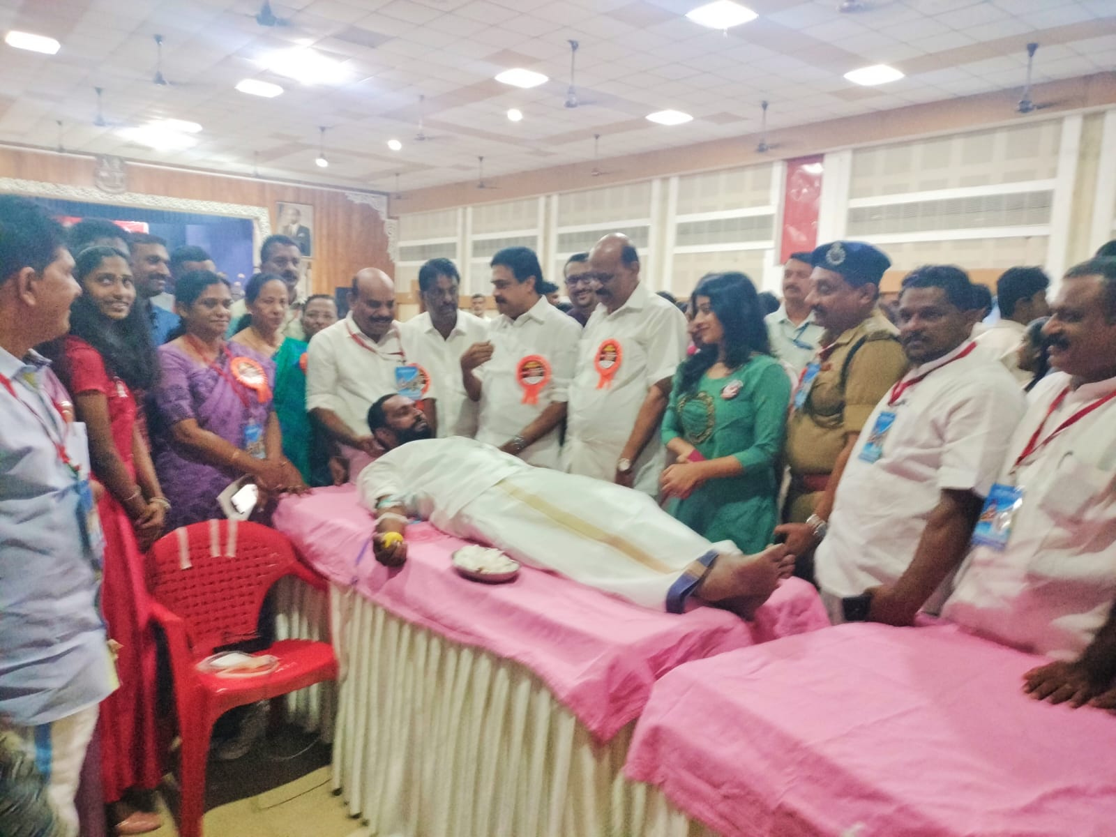 പാലാ ബ്ലഡ് ഫോറം ജനറൽ കൺവീനർ ഷിബു തെക്കേമറ്റത്തിൻ്റെ 125-ാമത് രക്തദാനത്തോട് അനുബന്ധിച്ച് നടക്കുന്ന മെഗാ രക്തദാന ക്യാമ്പിൽ ജില്ലാ പോലീസ് മേധാവി എ ഷാഹുൽ ഹമീദ് ഐ.പി.എസും സിനി ആർട്ടിസ്റ്റും മോഡലുമായ ട്രിനിറ്റി എലിസാ പ്രകാശും രക്തം ദാനം ചെയ്തു .