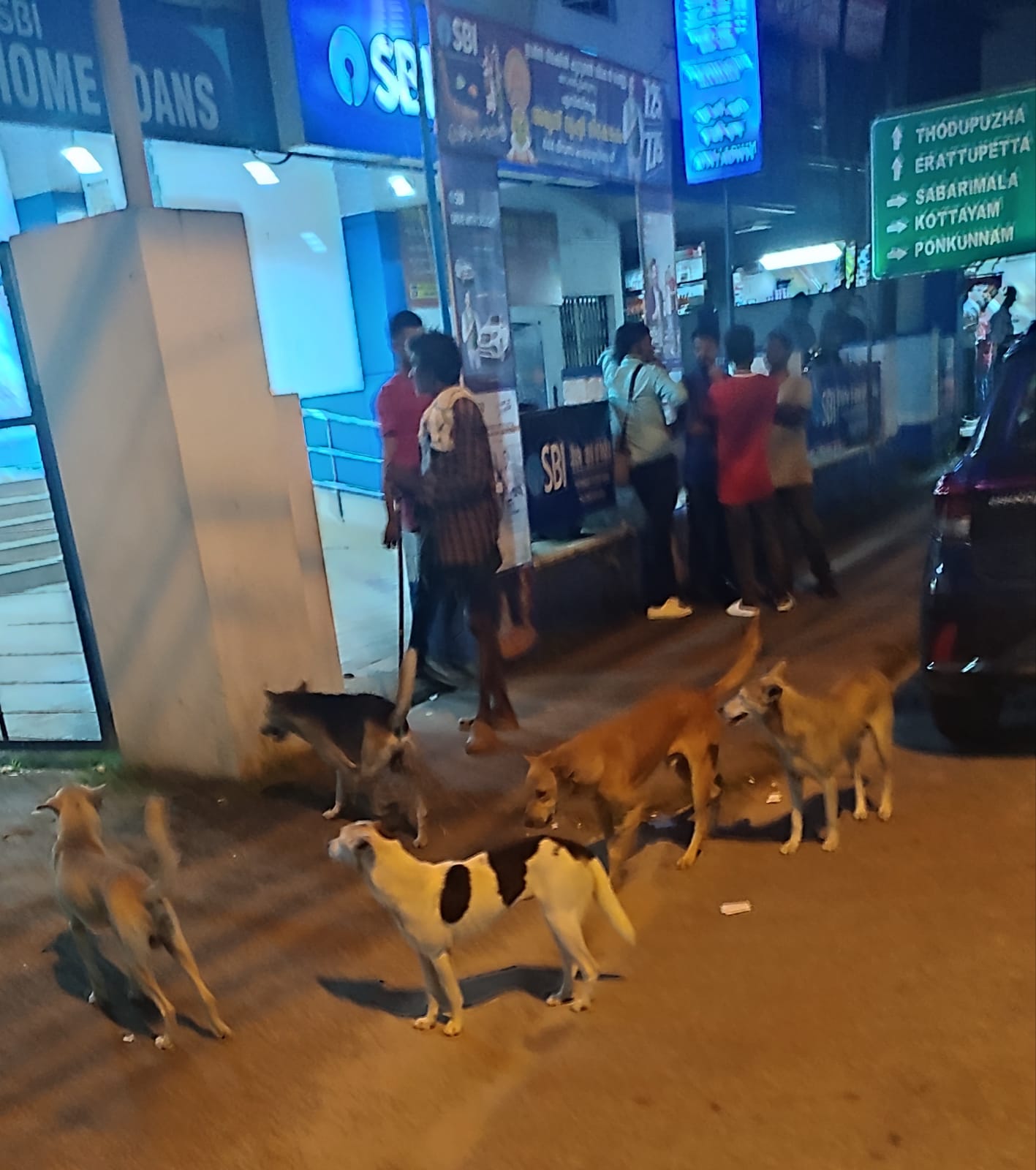 കഴിഞ്ഞു ദിവസം ഫുട്പാത്തിലൂടെ എ റ്റി എം ലേയ്ക്കു പോയി ആളിന്റെ പിറകെ നായ്ക്കള് കുട്ടുമായി ഓടി ചെല്ലുകമ്പോള് തട്ടി പേടിച്ചു വീഴുകയുണ്ടായി മറ്റുയുള്ളവര് ബഹളം വച്ചമ്പോള് നായ്ക്കള് പല ഭാഗത്തേയ്ക്ക് ചിതറി ഓടി.