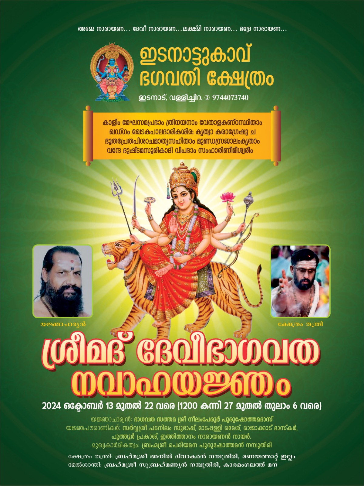 കോട്ടയം :പാലാ :പ്രസിദ്ധവും പുണ്യപുരാതനവുമായ ഇടനാട്ടുകാവ് ഭഗവതി ക്ഷേത്രസന്നിധിയിൽ ശ്രീമദ് ദേവീ ഭാഗവത നവാഹയജ്ഞം ആചാരവിധിപ്രകാരം 2024 ഒക്ടോബർ 13 മുതൽ 22 വരെ (1200 കന്നി 27 മുതൽ തുലാം 6 വരെ) ഭക്ത്യാദരപൂർവ്വം നടത്തുവാൻ നിശ്ചയിച്ചിരിക്കുന്നു.