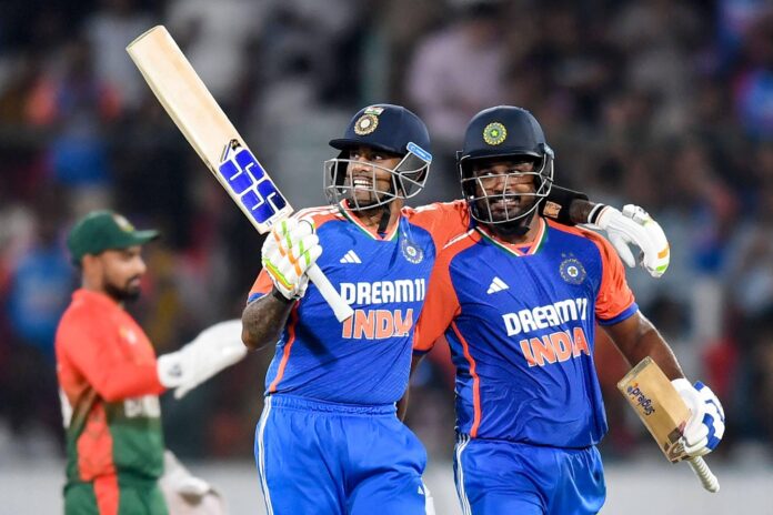ഹൈദരാബാദ്: ടി20 പരമ്പരയിലെ അവസാന മത്സരത്തിൽ സഞ്ജുവിന്റെ വെടിക്കെട്ട് പ്രകടനത്തോടെ ഇന്ത്യക്ക് വമ്പൻ ജയം. 133 റൺസിന്റെ തകർപ്പൻ ജയമാണ് ബംഗ്ലാദേശിനെതിരെ ഇന്ത്യ സ്വന്തമാക്കിയത്, നിശ്ചിത ഓവറിൽ ആറു വിക്കറ്റ് നഷ്ടത്തിൽ ഇന്ത്യ 297 റൺസടിച്ചെടുത്തു. ബംഗ്ലാദേശിന് 20 ഓവറിൽ ഏഴ് വിക്കറ്റ് നഷ്ടത്തിൽ 164 റൺസെടുക്കാനേ സാധിച്ചുള്ളൂ. ഇതോടെ ബംഗ്ലാദേശിനെതിരായ ടി20 പരമ്പര ഇന്ത്യ തൂത്തുവാരി (3-0), അന്താരാഷ്ട്ര ട്വന്റി20 ക്രിക്കറ്റിലെ ഏറ്റവും ഉയർന്ന രണ്ടാമത്തെ ടീം സ്കോറാണ് ഇന്ത്യ ഹൈദരാബാദിൽ സ്വന്തമാക്കിയത്.