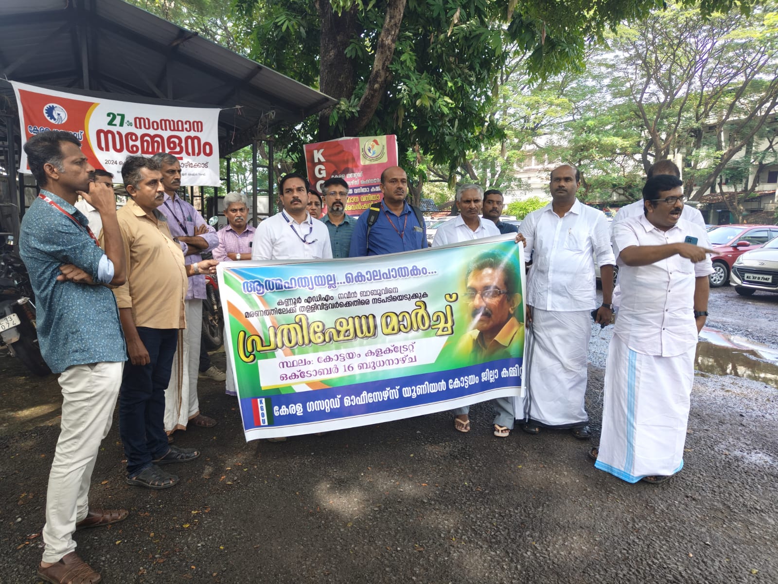 കണ്ണൂർ എ ഡി എം നവീൻ ബാബുവിന്റെ ആത്മഹത്യയുമായി ബന്ധപ്പെട്ട് കേരള ഗസറ്റഡ് ഓഫീസേഴ്സ് യൂണിയൻ സംസ്ഥാനത്തുടനീളം ജില്ലാ കേന്ദ്രങ്ങൾ കേന്ദ്രീകരിച്ചു നടത്തിയ പ്രതിഷേധത്തിന്റെ ഭാഗമായി KGOU കോട്ടയം ജില്ലാ കമ്മിറ്റി യുടെ ആഭിമുഖ്യത്തിൽ കളക്ട്രേറ്റിന് മുന്നിൽ സംഘടിപ്പിച്ച പ്രതിഷേധ പരിപാടി . സംസ്ഥാന സെക്രട്ടറി  എസ് . ബിനോജ് ഉദ്ഘാടനം ചെയ്തു.