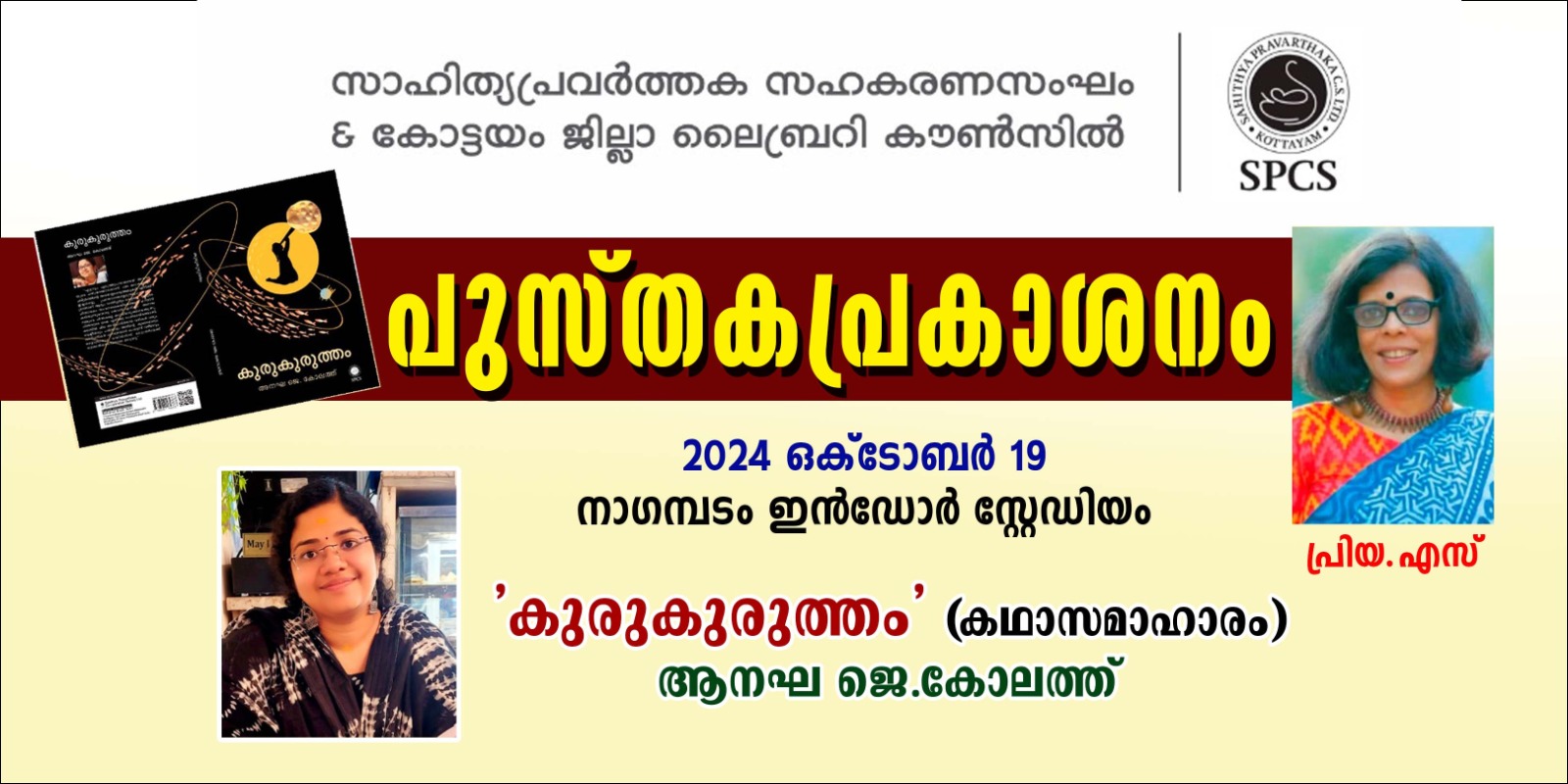 കോട്ടയം :സാഹിത്യപ്രവർത്തകസഹകരണസംഘം പ്രസിദ്ധീകരിക്കുന്ന ‘കുരുകുരുത്തം’ (അനഘ ജെ കോലത്ത്) എന്ന കഥാസമാഹാരം നാളെ പ്രകാശിതമാവുകയാണ്. കോട്ടയം നാഗമ്പടം ഇൻഡോർ സ്റ്റേഡിയ ത്തിൽവെച്ച് നടക്കുന്ന പുസ്തകോത്സവത്തിൽ ഒക്ടോബർ 19ന് ഉച്ചയ്ക്ക് 1.30ന് ആണ് പ്രകാശനച്ചടങ്ങ്.