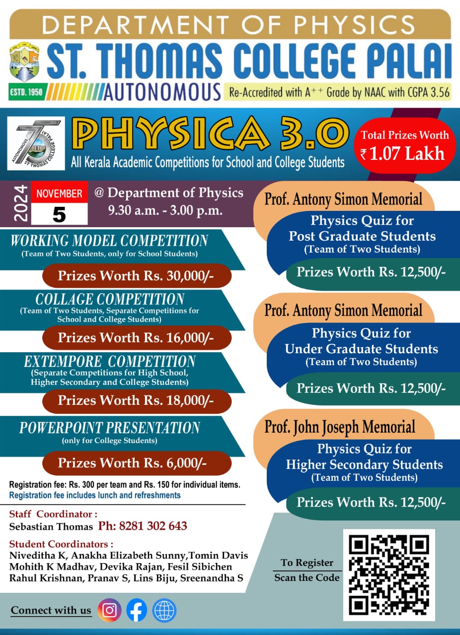 പാലാ സെൻറ് തോമസ് കോളേജിലെ ഫിസിക്സ് ഡിപ്പാർട്ട്മെന്റിന്റെ ആഭിമുഖ്യത്തിൽ സ്കൂൾ, ഹയർ സെക്കഡറി സ്കൂൾ, കോളേജ് വിദ്യാർത്ഥികൾക്കായി അഖില കേരള അടിസ്ഥാനത്തിൽ ,ഫിസിക്കാ- 3.0 , അക്കാദമിക് മത്സരങ്ങൾ സംഘടിപ്പിക്കുന്നു.