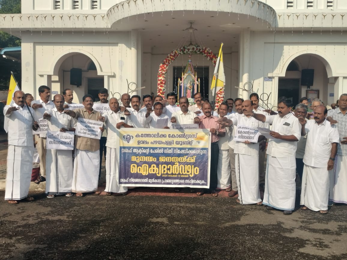 പാലാ :പൊരുതുന്ന മുനമ്പം ജനതയ്ക്ക് പാലാക്കാരുടെ ഐക്യദാർഢ്യം പ്രഖ്യാപിച്ചു കൊണ്ട് എ കെ സി സി ളാലം പള്ളിയുടെ കാൽകുരിശിന് മുന്നിൽ നിന്ന് ഐക്യദാർഢ്യ പ്രതിജ്ഞ ചൊല്ലി.മുനമ്പം മക്കളെ നെഞ്ചോട് ചേർത്ത് നിർത്തും എന്നായിരുന്നു പ്രതിജ്ഞയുടെ സംക്ഷിപ്ത രൂപം .രാവിലെ ഒൻപതോടെ എ കെ സി സി പ്രവർത്തകർ മുദ്രാവാക്യം മുഴക്കി സജീവമായി.