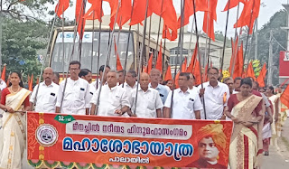 പാലാ :32-ാമത് മീനച്ചിൽ നദീതട ഹിന്ദു മഹാസംഗമത്തിന് വിളംബര ഘോഷയായാത്രയോടെ പ്രൗഢമായ തുടക്കും. ചെത്തിമറ്റം പുതിയകാവ് ദേവി ക്ഷേത്രത്തിൽനിന്ന് ആരംഭിച്ച ഘോഷയാത്രയിൽ വാദ്യമേളങ്ങൾ, ഭജന സംഘങ്ങൾ, നിശ്ചല ദൃശ്യം, നാടൻ കലാരൂപങ്ങൾ എന്നിവ മാറ്റു കൂട്ടി. സ്വാഗത സംഘം ഭാരവാഹികളായ ഡോ.എൻ.കെ.മഹാദേവൻ, കെ.എൻ.ആർ.നമ്പൂതിരി, അഡ്വ.രാജേഷ് പല്ലാട്ട്, അഡ്വ.ഡി. പ്രസാദ്,സി.കെ.അശോകൻ,ഡോ.പി.സി. ഹരികൃഷ്ണൻ, കെ.കെ.ഗോപകുമാർ, അഡ്വ.ജി. 1.ജി. അനീഷ്, അ കെ.വി.പ്രസാദ്ദുമാർ, റെജി കുന്നനാംകുഴി, എം.പി. ശ്രീനിവാസ്, വി.വിവേക്,കെ.എം. അരുൺ, ടി.കെ.ഹരികൃഷ്ണൻ തുടങ്ങിയവർ നേതൃത്വം നൽകി. സംഗമ നഗരിയായ വെള്ളാപ്പാട് ഭഗവതി ക്ഷേത്ര സന്നിധിയിലെ രാമകൃഷ്ണാനന്ദ സ്വാമി നഗറിൽ ഘോഷയാത്ര സമാപിച്ചു.