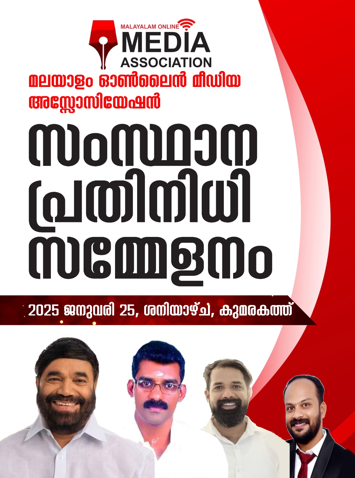 കോട്ടയം: മലയാളം ഓൺലൈൻ മീഡിയ അസോസിയേഷൻ നാലാമത് സംസ്ഥാന പ്രതിനിധി സമ്മേളനം ജനുവരി 25ന് കുമരകത്ത് വെച്ച് സഹകരണ, തുറമുഖം, ദേവസ്വം വകുപ്പ് മന്ത്രി വി.എൻ. വാസവൻ ഉദ്ഘാടനം ചെയ്യും.