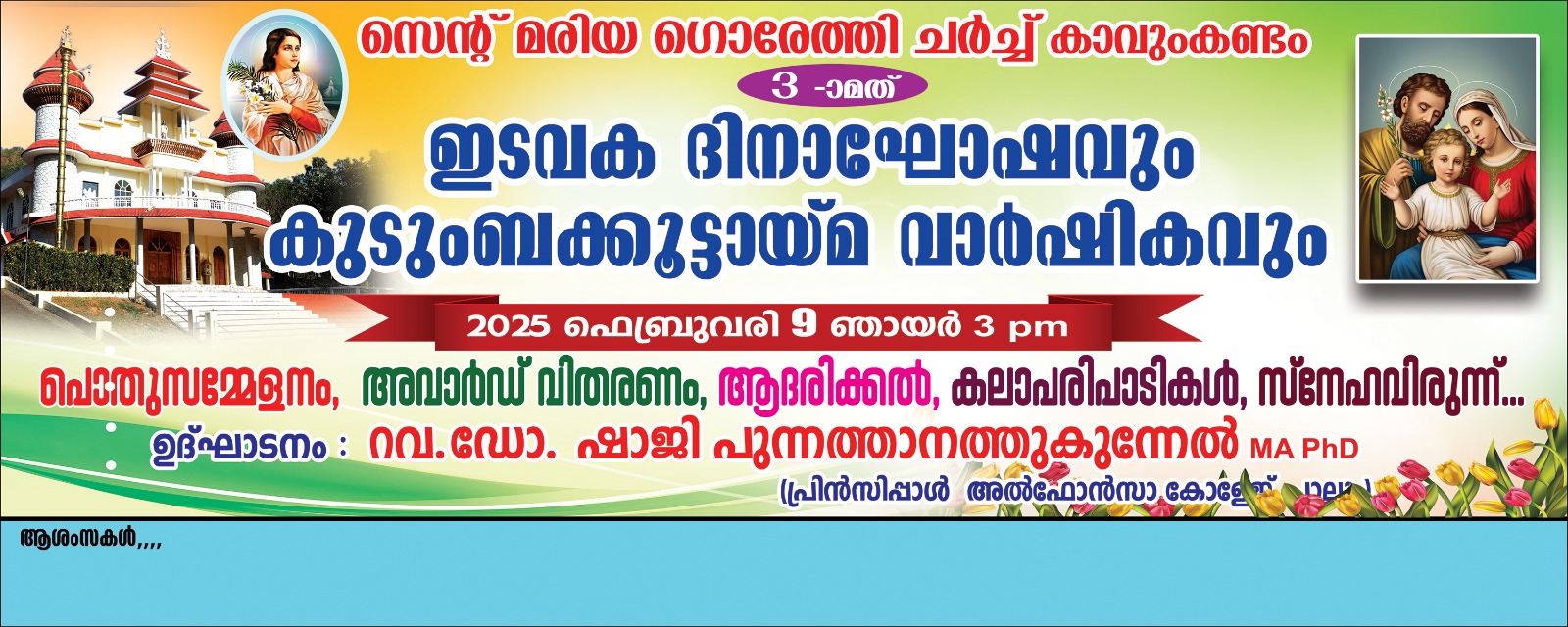 പാലാ :കാവുംകണ്ടം: കാവുംകണ്ടം ഇടവകയിലെ മൂന്നാമത് കുടുംബ കൂട്ടായ്മയുടെ വാർഷികവും ഇടവക ദിനാഘോഷവും ഒമ്പതാം തീയതി ഞായറാഴ്ച കാവുംകണ്ടം പാരീഷ് ഹാളിൽ വച്ച് നടത്തപ്പെടുന്നതാണ്. കുടുംബ കൂട്ടായ്മ പ്രസിഡന്റ് സെനീഷ് മനപ്പുറത്ത് അധ്യക്ഷത വഹിക്കുന്ന സമ്മേളനത്തിൽ പാലാ അൽഫോൻസാ കോളേജ് പ്രിൻസിപ്പാൾ റവ. ഡോ. ഷാജി പുന്നത്താനത്തുകുന്നേൽ വാർഷിക സമ്മേളനം ഉദ്ഘാടനം ചെയ്യും. ബിൻസി ഞള്ളായിൽ റിപ്പോർട്ട് അവതരിപ്പിക്കും. നൈസ് ലാലാ തെക്കലഞ്ഞിയിൽ ആമുഖപ്രഭാഷണം നടത്തും. വികാരി ഫാ. സ്കറിയ വേകത്താനം, കുടുംബ കൂട്ടായ്മ പാലാ രൂപത അസിസ്റ്റന്റ് ഡയറക്ടർ ഫാ. ആൽബിൻ പുതുപ്പറമ്പിൽ എന്നിവർ അനുഗ്രഹ പ്രഭാഷണം നടത്തും.