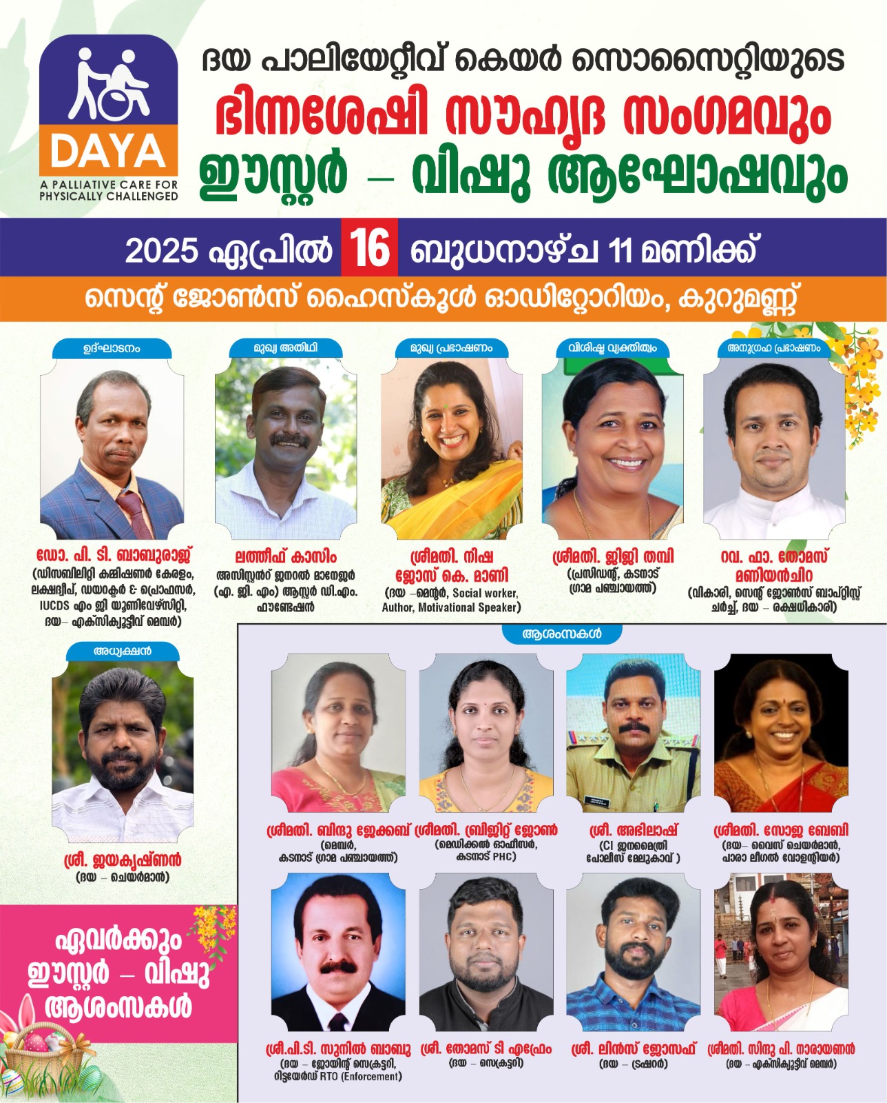 കുറുമണ്ണ്: ദയ പാലിയേറ്റീവ് കെയർ സൊസൈടി ഭിന്നശേഷി സൗഹൃദ സംഗമവും ഈസ്റ്റർ -വിഷു ആഘോഷവും 16 ന് രാവിലെ 11 ന് കുറുമണ്ണ് സെൻ്റ് ജോൺസ് ഹൈസ്കൂളിൽ നടക്കും.