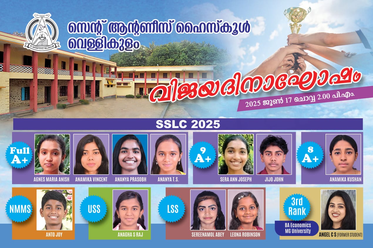 വെള്ളികുളം: വെള്ളികുളം സെൻറ് ആൻ്റണീസ് ഹൈസ്കൂളിൽ ഈ വർഷത്തെ എസ്.എസ്.എൽ.സി പരീക്ഷയിൽ 100% വിജയം നേടിയതിനോടനുബന്ധിച്ച് 17-ാംതീയതി ചൊവ്വാഴ്ച ഉച്ചകഴിഞ്ഞ് രണ്ടുമണിക്ക് സ്കൂൾ ഓഡിറ്റോറിയത്തിൽ വച്ച് വിജയദിനാഘോഷം നടത്തും. എസ്.എസ്.എൽ.സി പരീക്ഷയിൽ ഉന്നത വിജയം നേടിയ വിദ്യാർത്ഥികളെയും എൻ. എം . എം.എസ്, യു. എസ്. എസ്, എൽ. എസ്. എസ്. ജേതാക്കളെയും എം.ജി .യൂണിവേഴ്സിറ്റിബിഎ ഇക്കണോമിക്സ് പരീക്ഷയിൽ മൂന്നാം റാങ്ക് നേടിയ സ്കൂളിലെ പൂർവ്വ വിദ്യാർത്ഥിയായ എയ്ഞ്ചൽ സി.എസ്. ചൂണ്ടിയാനിപ്പുറത്തെയും സമ്മേളനത്തിൽ ആദരിക്കുന്നതാണ്.