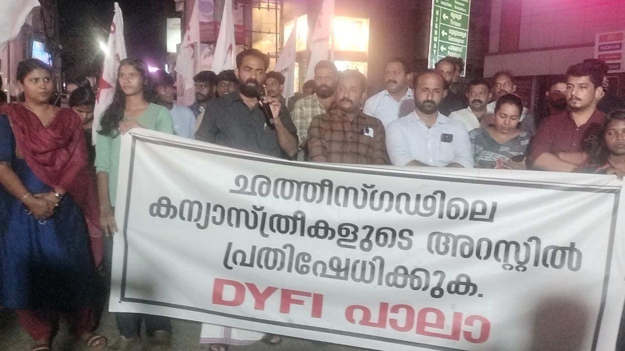 പാലാ :അമിത്ഷാ നൽകുന്ന തുട്ടുകൾ വാങ്ങി പുളച്ചിരുന്ന കാസ അഡ്മിന്മാർക്ക്;ഛത്തീസ്‌ ഗഡ്‌ പ്രശ്‌നത്തിൽ മിണ്ടാട്ടം മുട്ടിയെന്ന് ഡി വൈ എഫ് ഐ സംസ്ഥാന  സെക്രട്ടറി സി കെ സനോജ് അഭിപ്രായപ്പെട്ടു.സംഘ പരിവാറിന്റെ അജണ്ടയാണ് ബി ജെ പി സർക്കാർ നടപ്പിലാക്കുന്നത് .അവസാന ഡി വൈ എഫ് ഐ പ്രവർത്തകൻ ഉള്ളിടത്തോളം കാലം ബി ജെ പി യുടെ ഹിഡൻ അജണ്ട നടപ്പിലാവില്ലെന്ന്  സി കെ സനോജ് പറഞ്ഞു .ഛത്തീസ്ഗഡ് പ്രശ്നത്തിൽ പ്രതിഷേധം രേഖപ്പെടുത്തി കൊണ്ട് ഡി വൈ എഫ് ഐ പാലാ ബ്ലോക്ക് കമ്മിറ്റിയുടെ ആഭിമുഖ്യത്തിലുള്ള നൈറ്റ് മാർച്ച് ഉദ്‌ഘാടനം ചെയ്തു കൊണ്ട് പാലാ കുരിശുപള്ളി കവലയിൽ പ്രസംഗിക്കുകയായിരുന്നു ഡി വൈ എഫ് ഐ സംസ്ഥാന സെക്രട്ടറി  സി കെ സനോജ്.