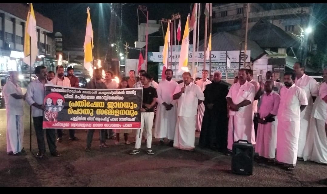 പാലാ :അത്യുന്നതിയിൽ നിൽക്കുന്ന ഭാരതാംബയുടെ നെഞ്ചിലെ വൃണമായി ഛത്തീസ്ഗഡ് സംഭവം മാറിയിരിക്കുന്നുവെന്ന് പാലാ ഗ്വാഡ ലൂപ്പെ പള്ളി വികാരി ഫാദർ ജോഷി പുതുപ്പറമ്പിൽ അഭിപ്രായപ്പെട്ടു.ഛത്തീസ്‌ ഗഡ്‌ സംഭവത്തിൽ പ്രതിഷേധം രേഖപ്പെടുത്തികൊണ്ട് ഒരു കൈയ്യിൽ മഞ്ഞയും വെള്ളയും കലർന്ന പേപ്പൽ പതാകയും മറുകൈയിൽ എരിയുന്ന തീപ്പന്തവുമായി പാലാ ഗ്വാഡലൂപ്പെ ഇടവകയുടെ നേതൃത്വത്തിൽ നടന്ന പ്രതിഷേധ യോഗത്തിൽ പ്രസംഗിക്കുകയായിരുന്നു ഫാദർ ജോഷി പുതുപ്പറമ്പിൽ.