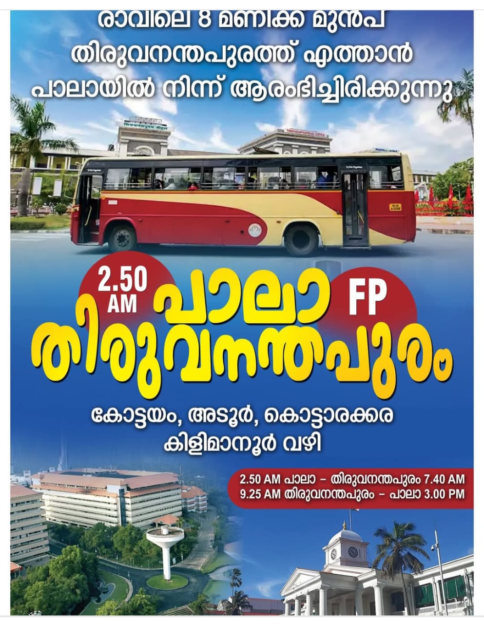 പാലാ: വെളുപ്പിന് പാലായിൽ നിന്നും തിരുവനന്തപുരത്തേയ്ക്ക് പാലാ ഡിപ്പോയിൽ നിന്നും പുതിയ സർവ്വീസ് ആരംഭിച്ചു.