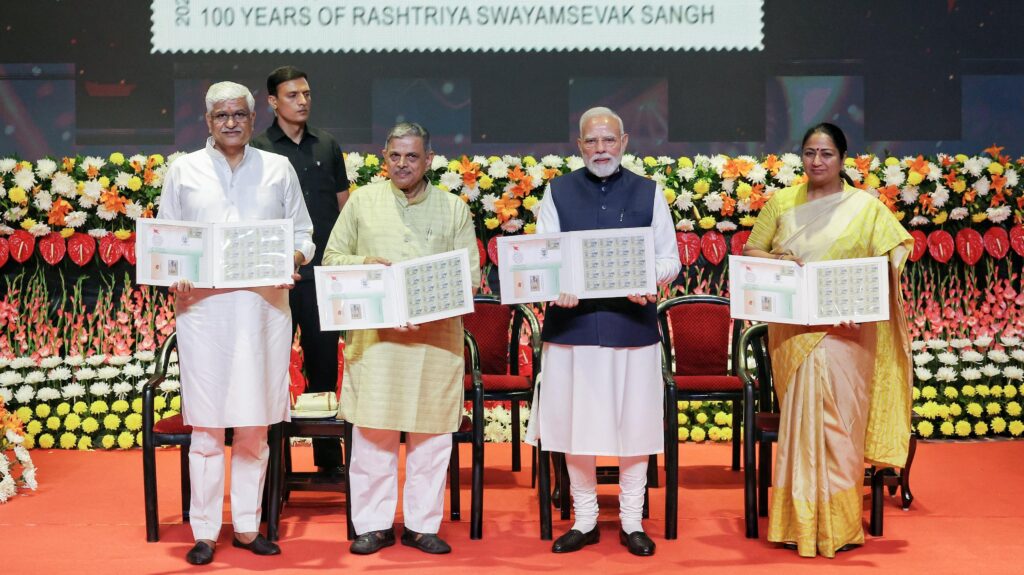 ആർ‌എസ്‌എസ് ശതാബ്ദി ആഘോഷങ്ങളുടെ ഭാഗമായി ഭാരതാംബയുടെ ചിത്രം ആലേഖനം ചെയ്ത 100 രൂപയുടെ നാണയവും പ്രത്യേക തപാൽ സ്റ്റാമ്പും പുറത്തിറക്കി പ്രധാനമന്ത്രി നരേന്ദ്ര മോദി