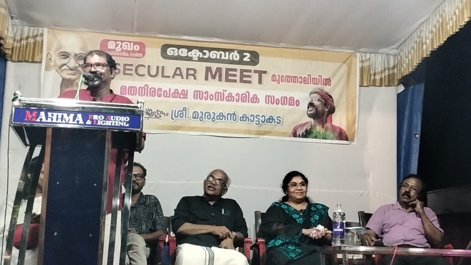 ഇന്ത്യയെയും കാവി വൽക്കരിക്കാൻ ശ്രമിക്കുമ്പോൾ അഫ്ഗാനിസ്താനാണ് ഓർമ്മയിൽ വരേണ്ടത് .ക്രിസ്തുവിനും 6000 വര്ഷം മുൻപ് സിന്ധു നദീതട നാഗരികത നില നിന്ന നാടാണ് നമ്മുടെ ഇന്ത്യ.ആ ഇന്ത്യയിൽ നിന്ന് വരുന്ന ഭരണ നേതാക്കൾക്ക് വൻ സ്വീകരണമാണ് വിദേശ രാജ്യങ്ങളിൽ ലഭിക്കുന്നത് .അത് ഭാരത സംസ്ക്കാരത്തിനുള്ള അംഗീകാരമാണ് .മതം രാഷ്ട്രമായി മാറ്റുവാൻ ശ്രമിക്കുന്നവർക്കെതിരെ ജാഗ്രത പുലർത്തണമെന്ന് മുരുകൻ കാട്ടാക്കട ആഹ്വാനം ചെയ്തു .യോഗത്തിനു മുൻപ് മതേതര കാൻവാസിൽ മുദ്രാവാക്യ രചന മുരുകൻ കാട്ടാക്കട ഉദ്ഘാടനം ചെയ്തു .നടി ഗായത്രി വർഷയും കണ്ണടകൾ വേണമെന്ന കവിത ശകലം കാൻവാസിൽ എഴുതി .