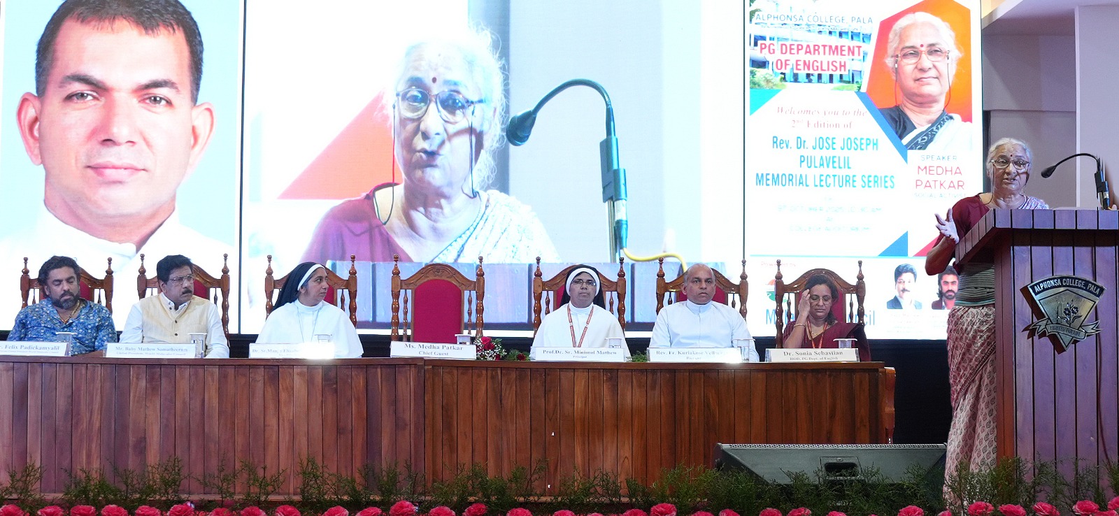പാലാ: ഇന്നത്തെ യുവജനങ്ങൾ ഭരണഘടന അനുശാസിക്കുന്ന ജനാധിപത്യമൂല്യങ്ങൾ ഉയർത്തിപ്പിടിക്കുന്നതിൽ ദത്തശ്രദ്ധരായിരിക്കണമെന്ന് മേധാ പട്കർ. പാലാ അൽഫോൻസാ കോളേജ് ഇംഗ്ലീഷ് വിഭാഗത്തിൻ്റെ നേതൃത്വത്തിൽ നടത്തപ്പെടുന്ന റവ. ഡോ ജോസ് ജോസഫ് പുലവേലിൽ മെമ്മോറിയൽ പ്രഭാഷണ പരമ്പരയുടെ രണ്ടാം പതിപ്പിൽ പ്രഭാഷണം നടത്തുകയായിരുന്നു പ്രമുഖ സാമൂഹ്യ പ്രവർത്തകയും പരിസ്ഥിതി സംരക്ഷകയുമായ ശ്രീമതി മേധാ പട്കർ.