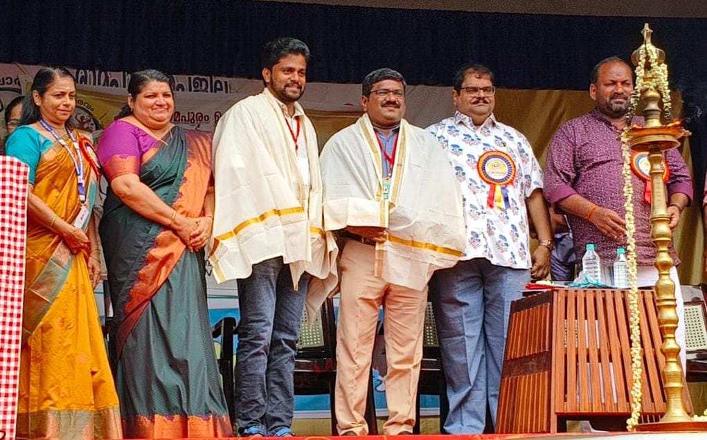 പാലാ / രാമപുരം : പാലക്കാട് നടന്ന സംസ്ഥാന സ്കൂൾ ശാസ്ത്രോത്സവത്തിൽ ഗണിതശാസ്ത്രം ടീച്ചിങ് എയ്ഡ് യുപി വിഭാഗം മത്സരത്തിൽ എ ഗ്രേഡോടെ ഒന്നാം സ്ഥാനം കരസ്ഥമാക്കിയ ജോസഫ് കെ വി, ഹൈസ്കൂൾ വിഭാഗം ടീച്ചിങ് എയ്ഡ് മത്സരത്തിൽ എ ഗ്രേഡ് കരസ്ഥമാക്കിയ മനു കെ ജോസ് എന്നീ അധ്യാപകർക്ക് രാമപുരം ഉപജില്ലാ കലോത്സവ ഉദ്ഘാടന വേദിയിൽവച്ച് ആദരവ് അർപ്പിച്ചു.