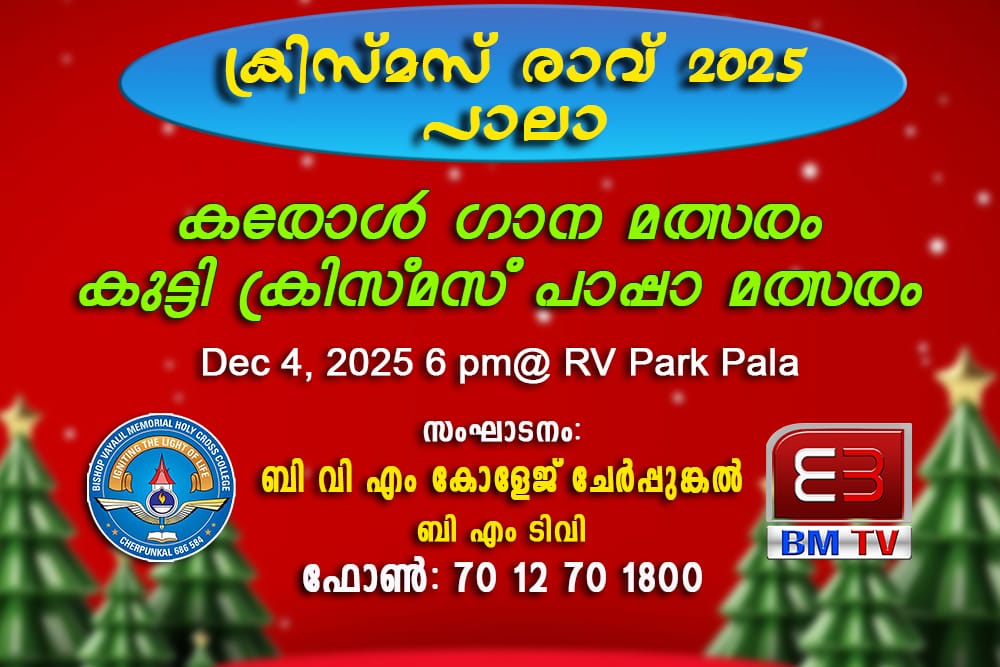 പാലാ: ബിവിഎം ഹോളിക്രോസ് കോളേജ് ചേർപ്പുങ്കലും ബി എം ടിവിയും ചേർന്ന് സംഘടിപ്പിക്കുന്ന ക്രിസ്മസ് രാവ് 2025 കരോൾ മത്സരം, പാപ്പാ മത്സരം എന്നിവയിലേക്കുള്ള രജിസ്ട്രേഷൻ ആരംഭിച്ചിരിക്കുന്നു. കരോൾ മത്സരത്തിൽ ഒന്നാം സമ്മാനം 10000 രൂപയും രണ്ടാം സമ്മാനം 7500 രൂപയും മൂന്നാം സമ്മാനം 5000 രൂപയും ലഭിക്കും. കുട്ടി ക്രിസ്മസ് പാപ്പാ മത്സരത്തിൽ ഒന്നാം സമ്മാനം 2000 രൂപയും, രണ്ടാം സമ്മാനം 1500 രൂപയും മൂന്നാം സമ്മാനം 1000 രൂപയും ലഭിക്കും. കൂടാതെ പങ്കെടുക്കുന്ന എല്ലാ മത്സരാർത്ഥികൾക്കും പ്രോത്സാഹന സമ്മാനങ്ങളും നൽകുന്നു. ഡിസംബർ 4 ന് ആണ് മത്സരം നടക്കുക. ഡിസംബർ 4 ഉച്ചയ്ക്ക് 12 മണി വരെ രജിസ്ട്രേഷൻ സ്വീകരിക്കും. സ്ഥലം പ്രായം പരിധികളില്ലാതെ എവിടെനിന്നുള്ളവർക്കും പങ്കെടുക്കാം. മത്സരത്തിന്റെ നിയമാവലി താഴെ കൊടുക്കുന്നു.