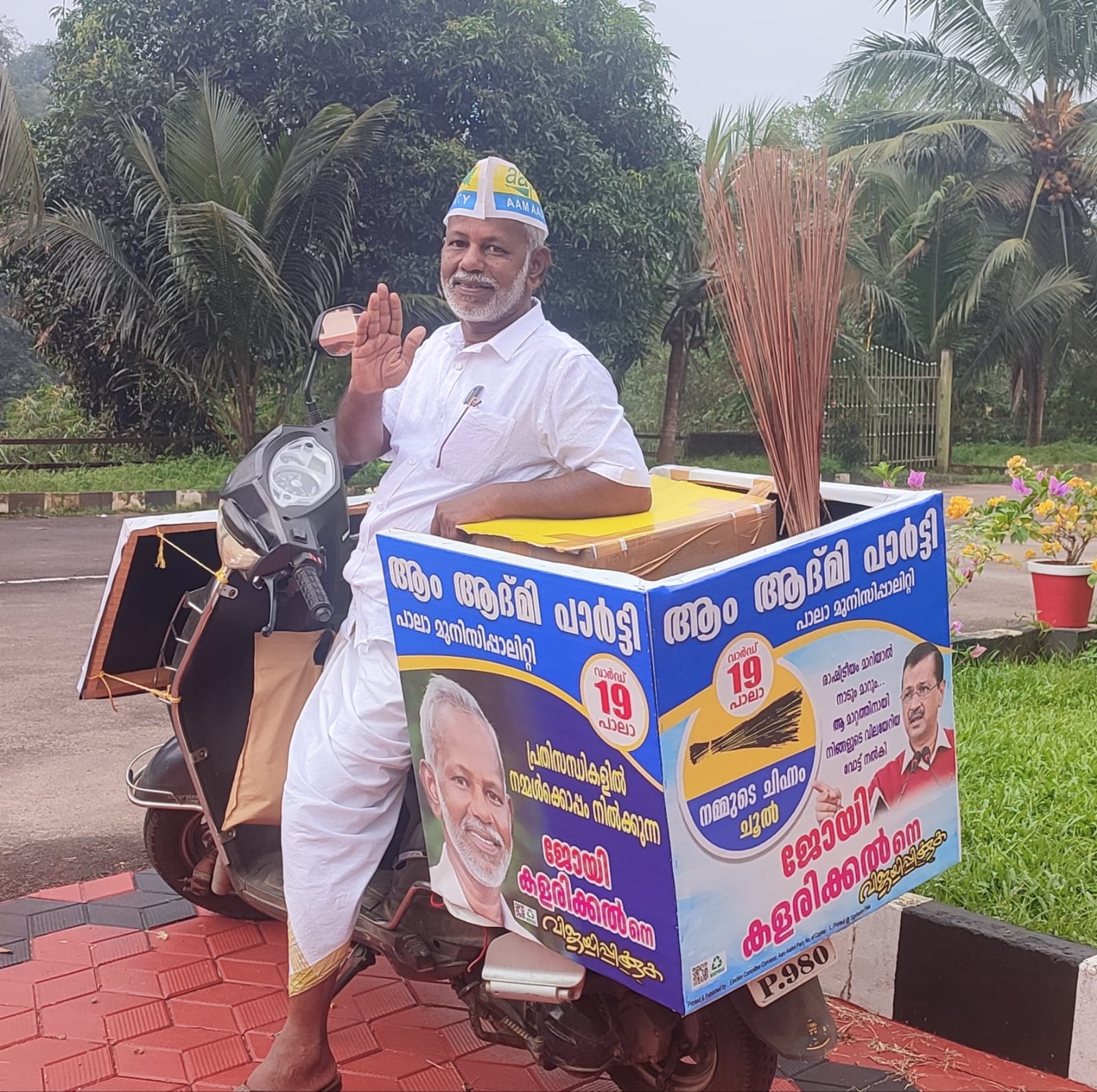 പാലാ :നേർത്ത ഒരു അനൗൺസ്‌മെന്റ് ശബ്ദം അടുത്ത് വന്നു നിന്നപ്പോഴാണ് പാലാ നഗരസഭയിലെ എ എ പി സ്ഥാനാർഥി ജോയി കളരിക്കലിന്റേതാണ് ആ അനൗൺസ്‌മെന്റ് എന്ന് തിരിച്ചറിഞ്ഞത് .സ്വന്തം സ്‌കൂട്ടറിൽ ചെറിയ മാറ്റം വരുത്തി തന്റെ പേരും ചിഹ്നവും എഴുതിയിരിക്കുന്നു .കൂടാതെ ആം ആദ്‌മി പാർട്ടിയുടെ തെരെഞ്ഞെടുപ്പ് അടയാളമായ ചൂലും കരുതിയിട്ടുണ്ട് .