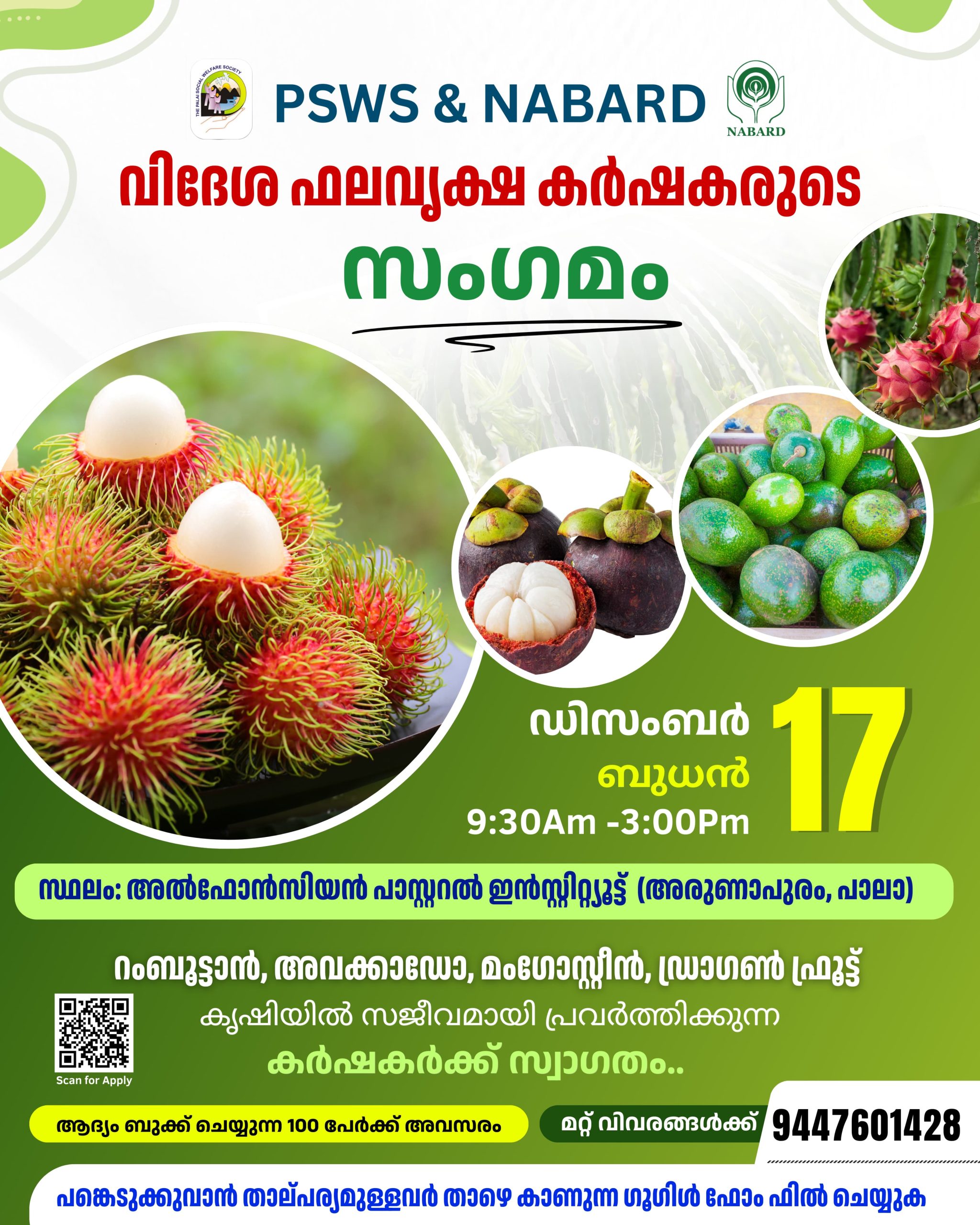 പാലാ സോഷ്യൽ വെൽഫെയർ സൊസൈറ്റി നബാർഡിൻ്റെ സഹകരണത്തോടെ നടപ്പാക്കുന്ന ” സംയോജിത കൃഷി വികസന പദ്ധതി” യുടെ ഭാഗമായി പാലാ അരുണാപുരം അൽഫോൻസിയൻ പാസ്റ്ററൽ ഇൻസ്റ്റിറ്റ്യൂട്ടിൽ ഡിസംബർ 17 ബുധൻ രാവിലെ 9.30 മുതൽ വൈകിട്ട് 3 മണി വരെ കാർഷിക സംരംഭകത്വ ശില്പശാല സംഘടിപ്പിക്കുകയാണ്. വിദേശ ഫലവൃക്ഷ വിളകളുടെ വാണിജ്യ കൃഷിയിൽ സജീവമായി പ്രവർത്തിക്കുന്ന നൂറ് കർഷകർക്കാണ് ഈ വർക്ക്ഷോപ്പിൽ പങ്കെടുക്കാനാവുക. മേൽ പറഞ്ഞ വിളകളുടെ ശാസ്ത്രീയ കൃഷി രീതികൾ, മാർക്കറ്റിങ്ങ് സാദ്ധ്യതകൾ തുടങ്ങിയവ വിശദീകരിക്കുന്ന ശിൽപശാലയിൽ പങ്കെടുക്കാനാഗ്രഹിക്കുന്നവർ താഴെ കാണുന്ന ഗൂഗിൾ ഫോം പൂരിപ്പിച്ച് പേര് രജിസ്റ്റർ ചെയ്യണം. കൂടുതൽ വിവരങ്ങൾക്ക് ബന്ധപ്പെടുക.
