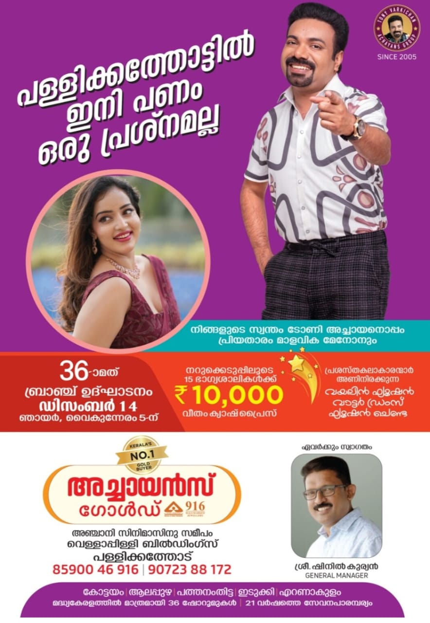 അച്ചായൻസ് ഗോൾഡിൻ്റെ 36-ാമത്തെ ഷോറൂം പള്ളിക്കത്തോട് അഞ്ചാനി സിനിമാസിന് സമീപം വെള്ളാപള്ളി ബിൽഡിംഗ്സിൽ ഡിസംബർ 14 ഞായറാഴ്ച വൈകുന്നേരം 4 മണി മുതൽ പ്രവർത്തനം ആരംഭിക്കുകയാണ്.