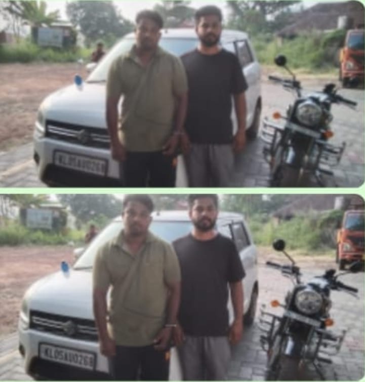 കോട്ടയം എക്സൈസ് സർക്കിൾ ഓഫീസിലെ അസിസ്റ്റൻഡ്  എക്സൈസ്  ഇൻസ്പെക്ടർ ബി ആനന്ദ രാജിന് ലഭിച്ച രഹസൃ വിവരത്തിൻ്റെ അടിസ്ഥാനത്തിൽ വാഗണർ കാറിലും ബുള്ളറ്റിലും മാഹി മദ്യം കടത്തിയ വൻ റാക്കറ്റിനെ പിടികൂടി.നീണ്ടൂർ സ്വദേശികളായ സുധിൻ പി മണി (32 ) ദീലീപ് കുമാർ (36) എന്നീ  യുവാക്കളാണ് അറസ്റ്റിലായത് .