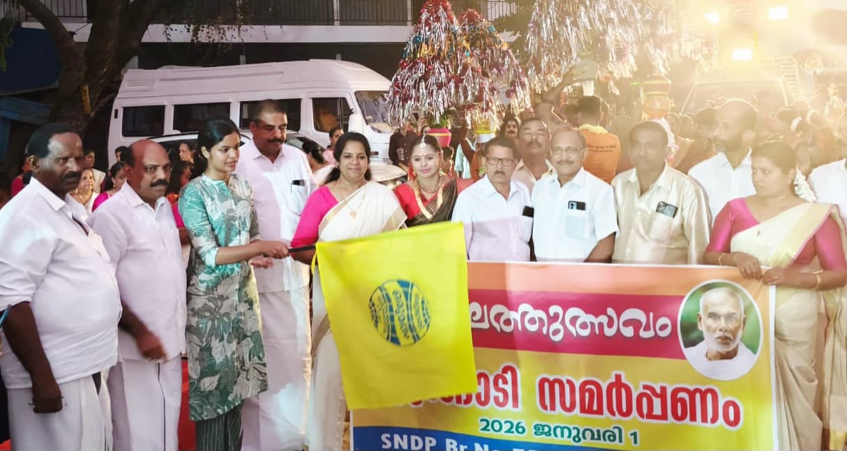 പാലാ: ളാലത്തുത്സവത്തോട്ടനുബന്ധിച്ചുള്ള എസ്എൻഡിപി പാലാ ടൗൺ ശാഖയുടെ എട്ടങ്ങാടി സമർപ്പണ ഘോഷയാത്രയുടെ ഫ്ലാഗ് ഓഫ് കർമ്മം പാലാ മുനിസിപ്പൽ ചെയർപേഴ്സൺ ദിയ പുളിക്കകണ്ടം ശാഖ പ്രസിഡന്റ് പി ജി അനിൽകുമാറിന് കൈമാറിക്കൊണ്ട് നിർവഹിച്ചു.