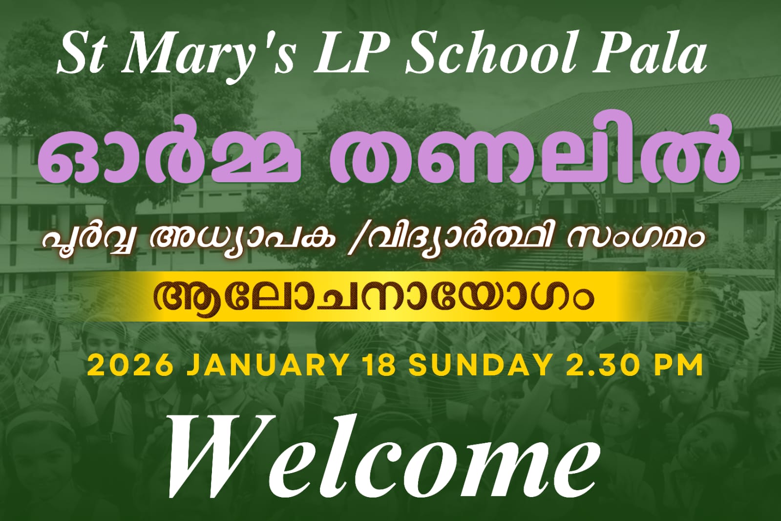 പാലാ :പ്രസിദ്ധമായ സെന്റ് മേരീസ് എൽ പി സ്കൂളിൽ പഠിച്ച പൂർവ്വ വിദ്യാർഥികൾ നാളെ ഞായറാഴ്ച 2.30 നു സ്കൂൾ അങ്കണത്തിൽ ഒത്തു ചേരുന്നു .ഇതിനു മുന്നൊരുക്കമായി വാട്ട്സ്ആപ്പ് ഗ്രൂപ്പും രൂപീകരിച്ചിരുന്നു .