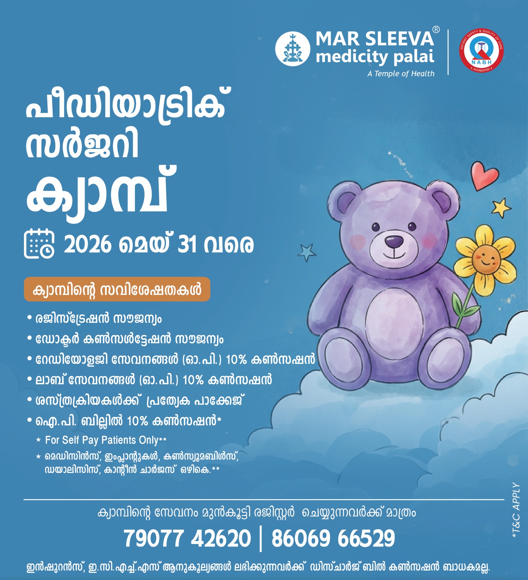 പാലാ :മാർ സ്ലീവാ മെഡിസിറ്റിയിൽ പീഡിയാട്രിക് സർജറി ക്യാമ്പ് മെയ് 31 വരെ നടത്തും. കുട്ടികളിലെ ജനിതകപ്രശ്നങ്ങൾ, ഹെർണിയ, മൂത്രവിസർജന സംബന്ധമായ അസുഖങ്ങൾ,സ്കോളിയോസിസ്, വയറിനുള്ളിലെ മറ്റ് രോഗങ്ങൾ എന്നിവയ്ക്ക് ശസ്ത്രക്രിയ വേണ്ട