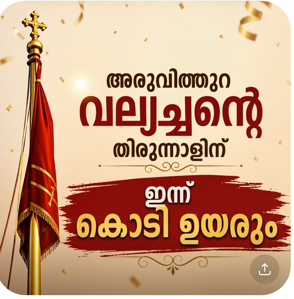 അരുവിത്തുറ സെന്റ് ജോര്ജ് ഫൊറോന പള്ളിയില് വിശുദ്ധ ഗീവര്ഗീസ് സഹദായുടെ തിരുനാളിന് ഇന്ന് കൊടിയേറും. വൈകിട്ട് 4ന് ചങ്ങനാശേരി അതിരൂപതാ മെത്രാപ്പൊലീത്ത മാര് തോമസ് തറയില് കുര്ബാന അര്പ്പിക്കും. 5.45ന് വികാരി ഫാ. മാത്യു ചന്ദ്രന്കുന്നേല് തിരുനാളിനു കൊടിയേറ്റും. തുടര്ന്ന് ദീപാലങ്കാരങ്ങള് തെളിക്കും. 6ന് പുറത്തുനമസ്കാരം, ഫാ. ക്ലമന്റ് എട്ടാനിയില് നേതൃത്വം നല്കും. 6.45ന് പൊന്കുരിശുമേന്തി നഗരപ്രദക്ഷിണം.