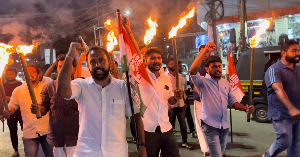 രാഹുൽ മാങ്കൂട്ടത്തിന്റെ അറസ്റ്റ്: എരിയുന്ന പന്തങ്ങളുമായി യൂത്ത് കോൺഗ്രസിന്റെ പ്രതിഷേധ പ്രകടനം