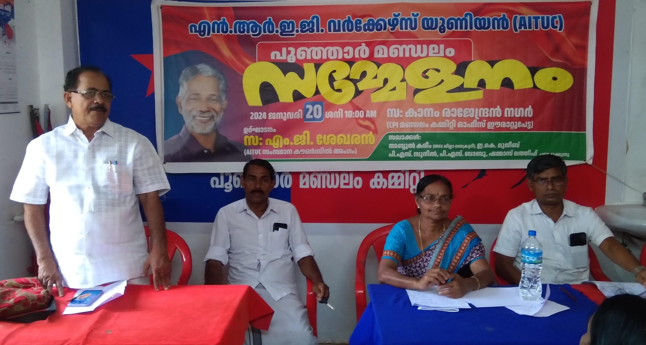പൂഞ്ഞാർ :എൻ ആർ ഇ ജി വർക്കേഴ്സ് യൂണിയൻ(എ ഐ റ്റി യു സി) പൂഞ്ഞാർ മണ്ഡലം സമ്മേളനം മണ്ഡലം പ്രസിഡന്റ് സഖാവ് പത്മിനി രാജശേഖരന്റെ അദ്ധ്വ ക്ഷതയിൽ സി പി ഐ പൂഞ്ഞാർ മണ്ഡലം കമ്മറ്റി ഓഫീസിൽ വച്ച് നടന്നു. സമ്മേളനം ജില്ലാ സെക്രട്ടറി സഖാവ് അബ്ദുൾ കരിം ഉൽഘാടനം ചെയ്തു.റിപ്പോർട്ട് മണ്ഡലം സെക്രട്ടറി സഖാവ് നൗഫൽ ഘാൻ അവതരിപ്പിച്ചു.