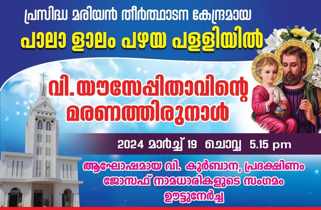 പാലാ: പ്രസിദ്ധ തീർത്ഥാടന കേന്ദ്രമായ പാലാ ളാലം പഴയ പള്ളിയിൽ വിശുദ്ധ യൗസേപ്പിതാവിന്റെ മരണത്തിരുനാൾ മാർച്ച് 19 ചൊവ്വാഴ്ച ഭക്തിനിർഭരമായി ആഘോഷിക്കുന്നു. അന്നേ ദിവസം വൈകുന്നേരം 4.30ന് ചെണ്ടമേളം 5 മണിക്ക് പ്രസുദേന്തിവാഴ്ച 5.15 ന് ആഘോഷമായ തിരുനാൾ കുർബാനയ്ക്ക് സന്ദേശത്തിനും പാലാ കമ്മ്യൂണിക്കേഷൻ ഡയറക്ടർ ഫാ. ക്രിസ്റ്റി പന്തലാനിക്കൽ മുഖ്യകാർമികത്വം വഹിക്കും.