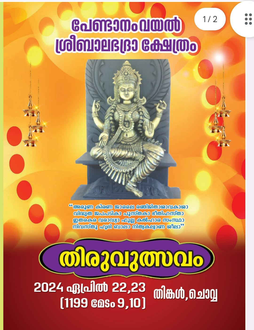 ഇടനാട് പേണ്ടാനംവയൽ ശ്രീബാലഭദ്രാ ക്ഷേത്രത്തിലെ ഉത്സവം 22, 23 തീയതികളിൽ ആഘോഷിക്കുമെന്ന് സെക്രട്ടറി പി.ജി. അനിൽപ്രസാദ് അറിയിച്ചു