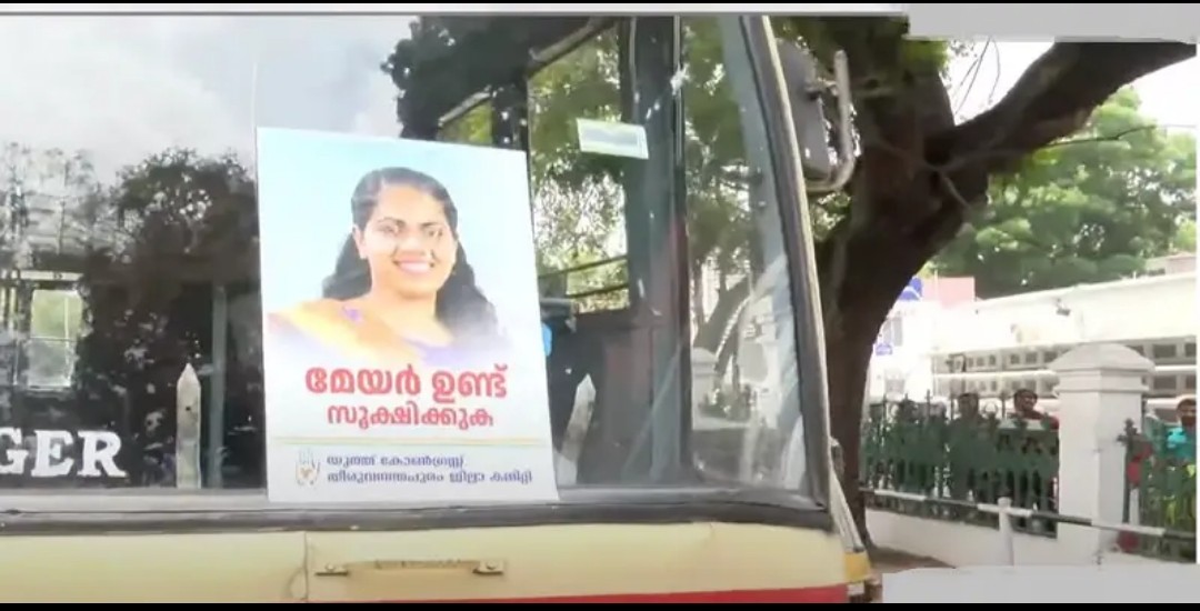 മേയറുണ്ട് സൂക്ഷിക്കുക !!’ കെഎസ്ആർടിസി ബസുകളില് പോസ്റ്റര് ഒട്ടിച്ച് യൂത്ത് കോണ്ഗ്രസ് പ്രതിഷേധം.തിരുവനന്തപുരം മേയർ ആര്യാരാജേന്ദ്രന്റെ കളര് ഫോട്ടോയോടു കൂടിയ പോസ്റ്ററാണ് തയ്യാറാക്കിയിരിക്കുന്നത്.