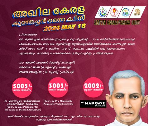 പാലാ :രാമപുരം :അഖില കേരള കുഞ്ഞച്ചൻ മെഗാ ക്വിസ് (മെയ് 18) പാഠഭാഗങ്ങൾ: 1.വാ.കുഞ്ഞച്ചൻ – 40% 2.വി. ലൂക്കായുടെ സുവിശേഷം 9 മുതൽ 16 വരെ അധ്യായങ്ങൾ – 40% 3.തിരുസഭ – 10% 4.പൊതുവിജ്ഞാനം – 10% നിബന്ധനകൾ: 1.ഒരു ടീമിൽ രണ്ട് അംഗങ്ങൾ. 2.മത്സരത്തിൽ പ്രായഭേദമന്യേ ആർക്കും പങ്കെടുക്കാവുന്നതാണ്. 3.P.O.C ബൈബിൾ ആണ് ഉപയോഗിക്കേണ്ടത്. 4.വാ. കുഞ്ഞച്ചനെ സംബന്ധിച്ചുള്ള ചോദ്യങ്ങൾക്ക് പ്രത്യേക അവലംബഗ്രന്ഥങ്ങൾ ഉണ്ടായിരിക്കുന്നതല്ല.