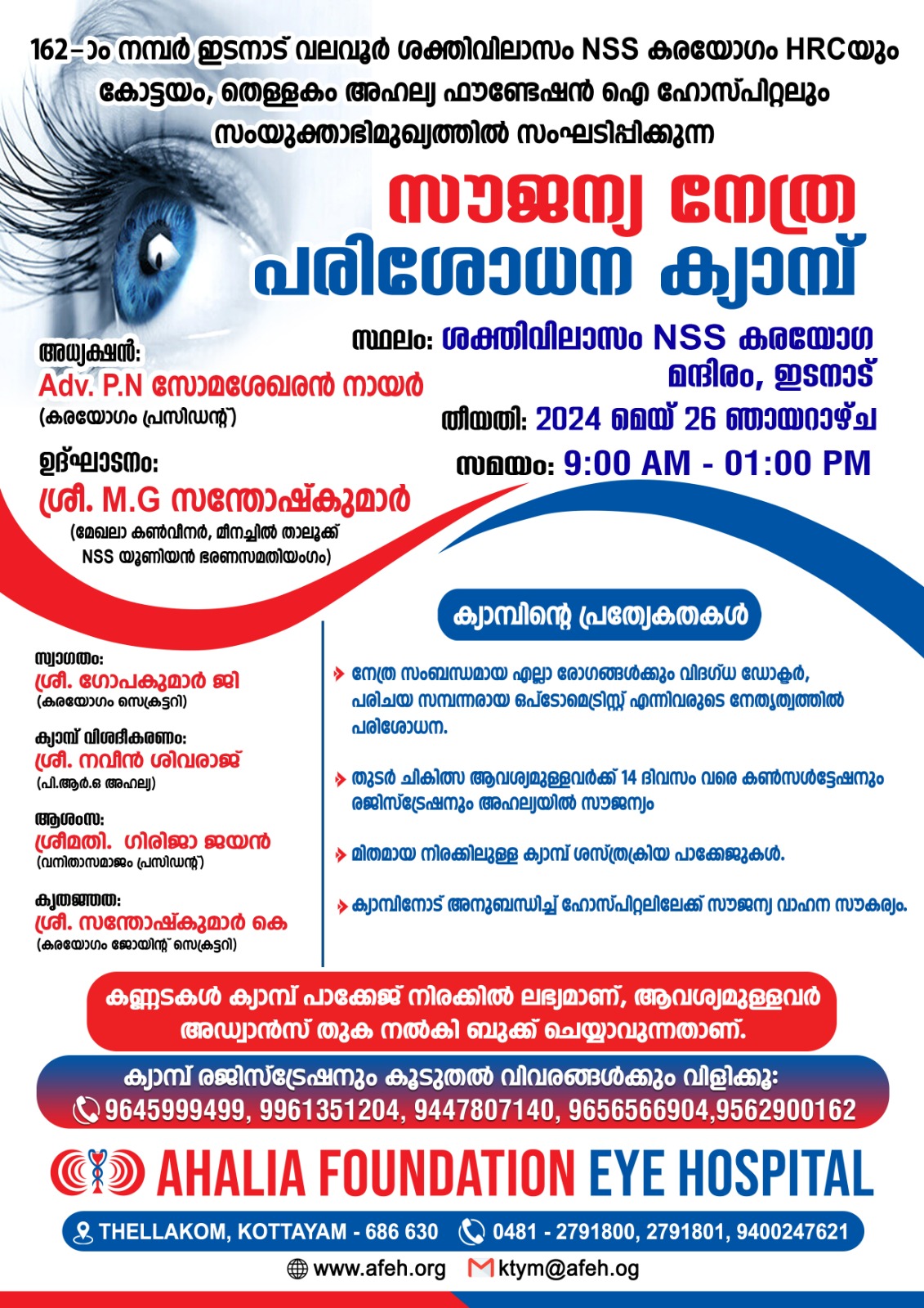 പാലാ: ഇടനാട്: 162-ാം നമ്പർ ഇടനാട് വലവൂർ ശക്തിവിലാസം എൻഎസ്എസ് കരയോഗം HRC യും കോട്ടയം, തെള്ളകം, അഹല്യ ഫൗണ്ടേഷൻ ഐ ഹോസ്പിറ്റലും സംയുക്തമായി സംഘടിപ്പിക്കുന്ന സൗജന്യ നേത്ര പരിശോധന ക്യാമ്പ് 26.05.24 ഞായറാഴ്ച ഇടനാട് ശക്തിവിലാസം എൻഎസ്എസ് കരയോഗ മന്ദിരത്തിൽ വച്ച് നടത്തപ്പെടുന്നു.