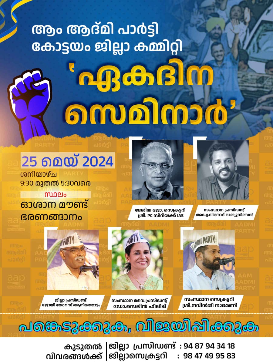 പാലാ. ആം ആദ്മി പാര്ട്ടി ജില്ലാ തല പ്രവർത്തകർക്കുള്ള ഏകദിന സെമിനാര് മെയ് 25 നു 9.30 മുതല് 5.30 വരെ ഭരണങ്ങാനം ഓശാന മൗണ്ടില് വച്ചു നടത്തൂകയാണ് .