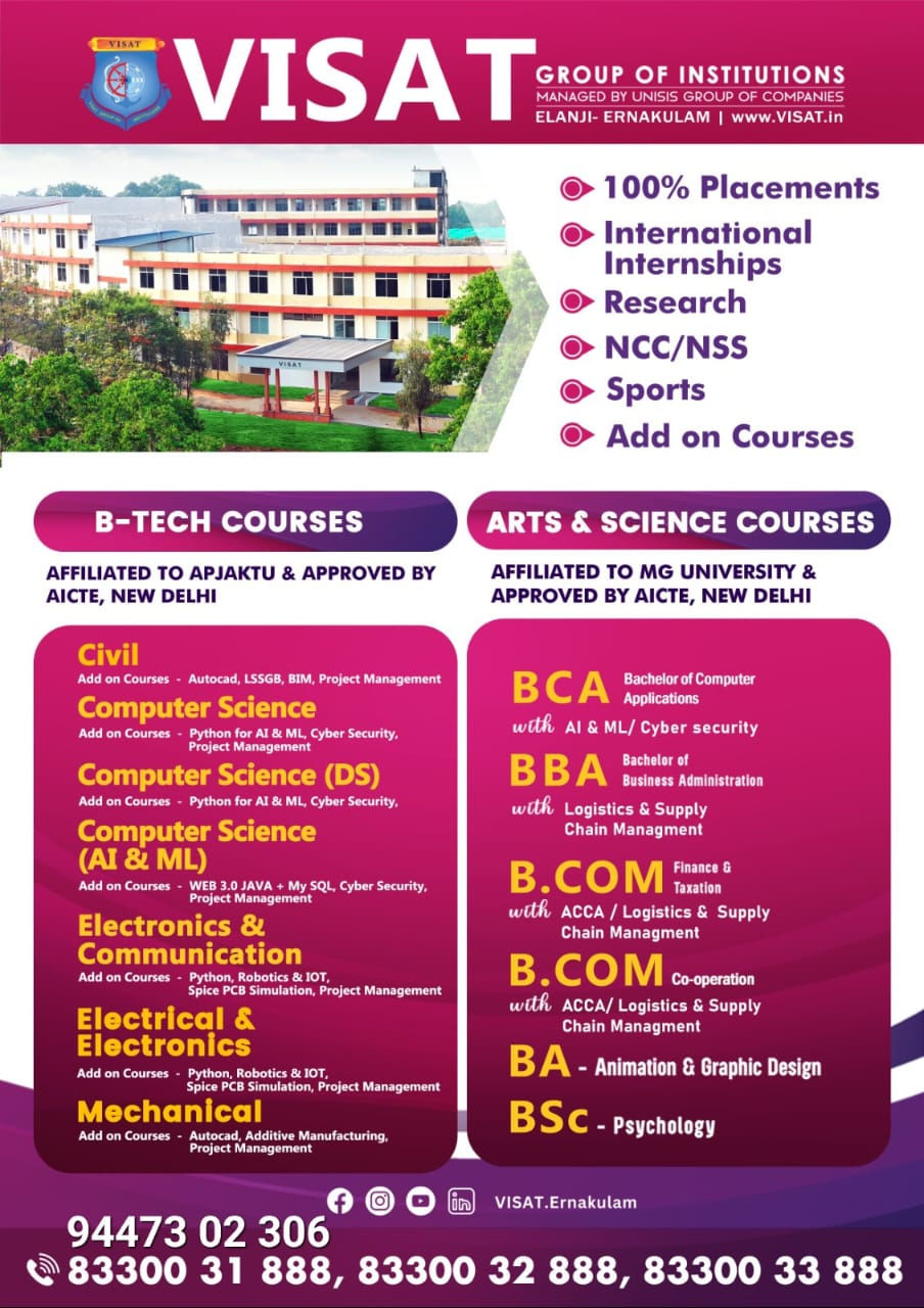 ഇന്ത്യയിലെ നമ്പർ 1 എൻബിഎഫ്‌സി ആയ മുത്തൂറ്റ് ഫിനാൻസ് ലിമിറ്റഡും ഇലഞ്ഞി വിസാറ്റ് കോളേജുമായി സഹകരിച്ചു ഓഡിറ്റ് എക്സിക്യൂട്ടീവ് പോസ്റ്റിലേക്കു ക്യാമ്പസ് റിക്രൂട്ട്മെന്റ് നടത്തുന്നു. ഡിഗ്രിയോ ഉപരിയോഗ്യതയോ ഉള്ള യുവാക്കൾക്കു വേണ്ടിയാണ് ഇന്റർവ്യൂ നടത്തുന്നത്.