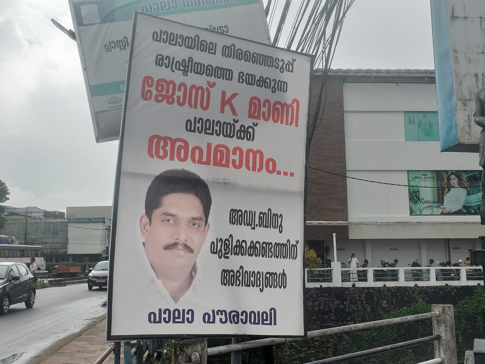 പാലായിൽ മൂന്നിടത്താണ് ഫ്ളക്സ് ബോർഡുകൾ സ്ഥാപിച്ചിട്ടുള്ളത്.അതേസമയം ജോസ് കെ മാണിയുടെ ഭയത്തെ കുറിച്ച് പറയുന്ന ധൈര്യ ശാലികൾ രാത്രിയിൽ ഫ്ളക്സ് ബോർഡ് സ്ഥാപിച്ചതെന്തിന് എന്നാണ് മാണി ഗ്രൂപ്പ് കേന്ദ്രങ്ങൾ പറയുന്നത് .പാലായിലെ പൗരസമിതിയുടെ പേരിൽ ചുളുവിൽ അഭിവാദ്യം കൊടുക്കുമ്പോൾ ഈ പൗരസമിതി ആരാണെന്നു കൂടി വ്യക്തമാക്കണമെന്ന് കേരളാ കോൺഗ്രസ് (എം)കേന്ദ്രങ്ങൾ അഭിപ്രായപ്പെട്ടു ..