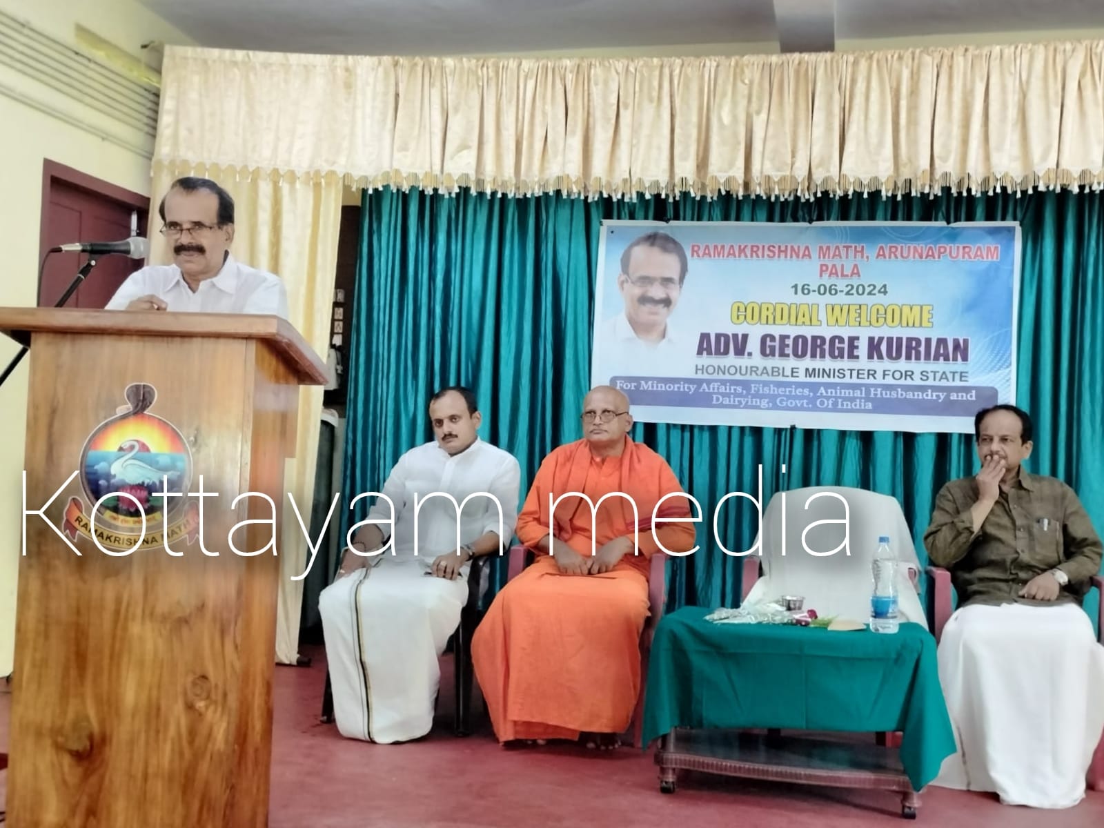 ശ്രീരാമ കൃഷ്ണ ആശ്രമത്തിലെ പ്രതിഷ്ഠയിൽ പൂക്കൾ അർപ്പിച്ച കേന്ദ്രമന്ത്രി ജോർജ് കുര്യൻ തുടർന്ന് സ്വീകരണ സമ്മേളനം നടക്കുന്ന ഹാളിലേക്ക് പോയി .പഴമക്കാരൊക്കെ അടുത്ത് വന്നു സൗഹൃദം പുലർത്തിയപ്പോൾ എല്ലാവരെയും പേര് എടുത്തു വിളിച്ചാണ് കേന്ദ്രമന്ത്രി അഭിസംബോധന ചെയ്തത്.1982 ലാണ് ഞാൻ പാലാ സെന്റ് തോമസ് കോളേജിൽ പഠിക്കാനെത്തുന്നത്.അന്ന് ഞാൻ വിദ്യാർത്ഥി മോർച്ചയുടെ ജില്ലാ സെക്രട്ടറി ആയിരുന്നു.വീട്ടിൽ പോയി വരുന്നത് ബുദ്ധിമുട്ടായപ്പോൾ എന്നാൽ ആശ്രമത്തിൽ കൂടിക്കോ എന്ന് നിർദ്ദേശം അംഗീകരിക്കുകയായിരുന്നു .