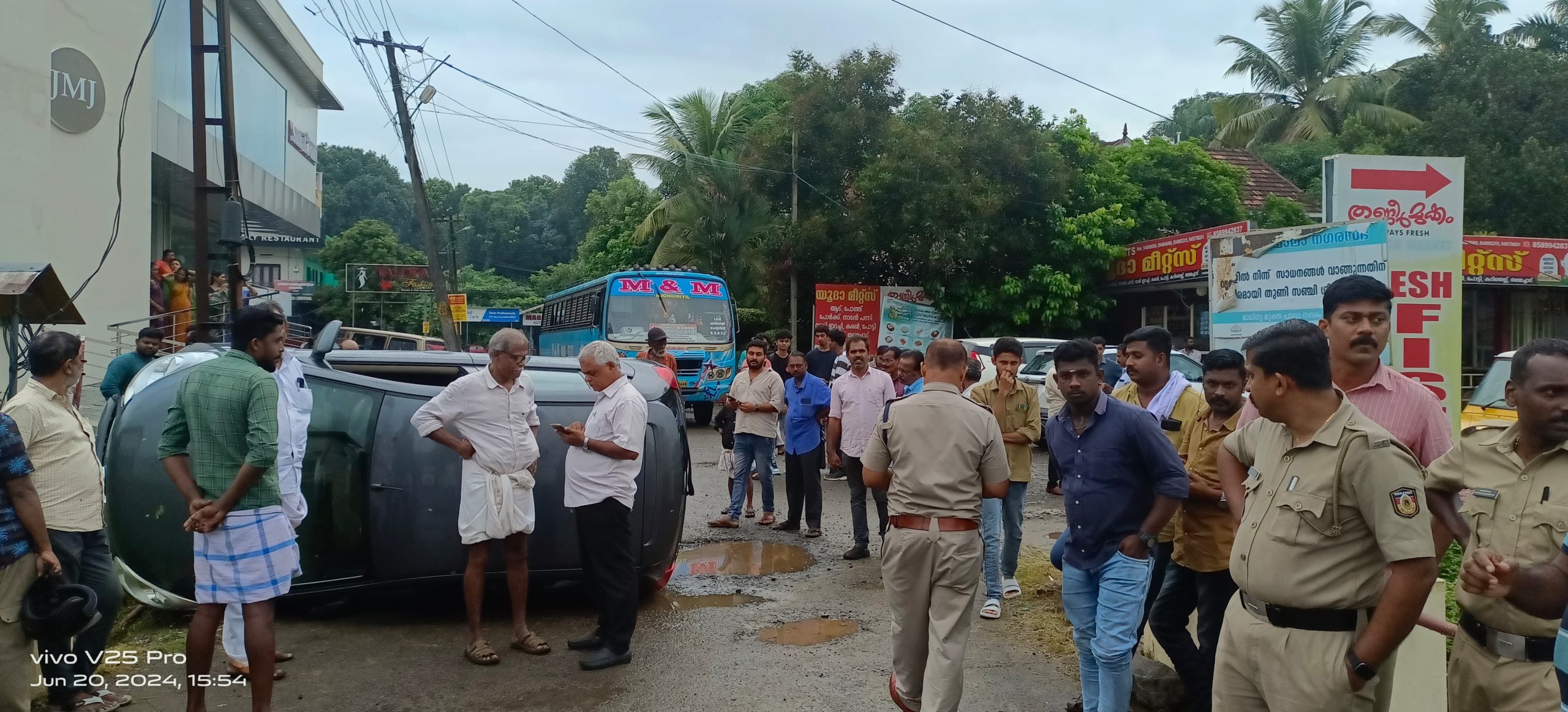 പാലായിൽ പുഴക്കര പാലത്തിൽ കാർ വട്ടം മറിഞ്ഞു ;ആർക്കും പരിക്കില്ല;പ്രഷർ താണുപോയതാണ് അപകട കാരണമെന്നു പ്രാഥമിക നിഗമനം