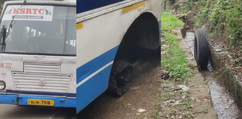 തിരുവനന്തപുരം നെടുമങ്ങാട് എട്ടാംകല്ലിൽ ഓടിക്കൊണ്ടിരുന്ന കെഎസ്ആർടിസി ബസിന്റെ ടയർ ഊരിത്തെറിച്ചു.